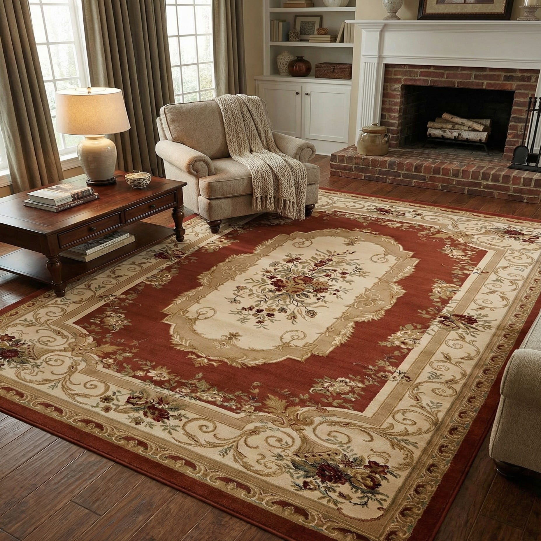 A rich brick red field frames an aubusson-inspired medallion in cream and tan, with a central bouquet of roses and foliage in red, rust red, tan, brown and green. Ornamental cartouches and scrolling acanthus weave through the design, while a broad cream border with delicate floral sprays and vinework ties the composition together. The pattern balances formal symmetry with tasteful floral detail, giving the piece a traditional, European-inspired character.