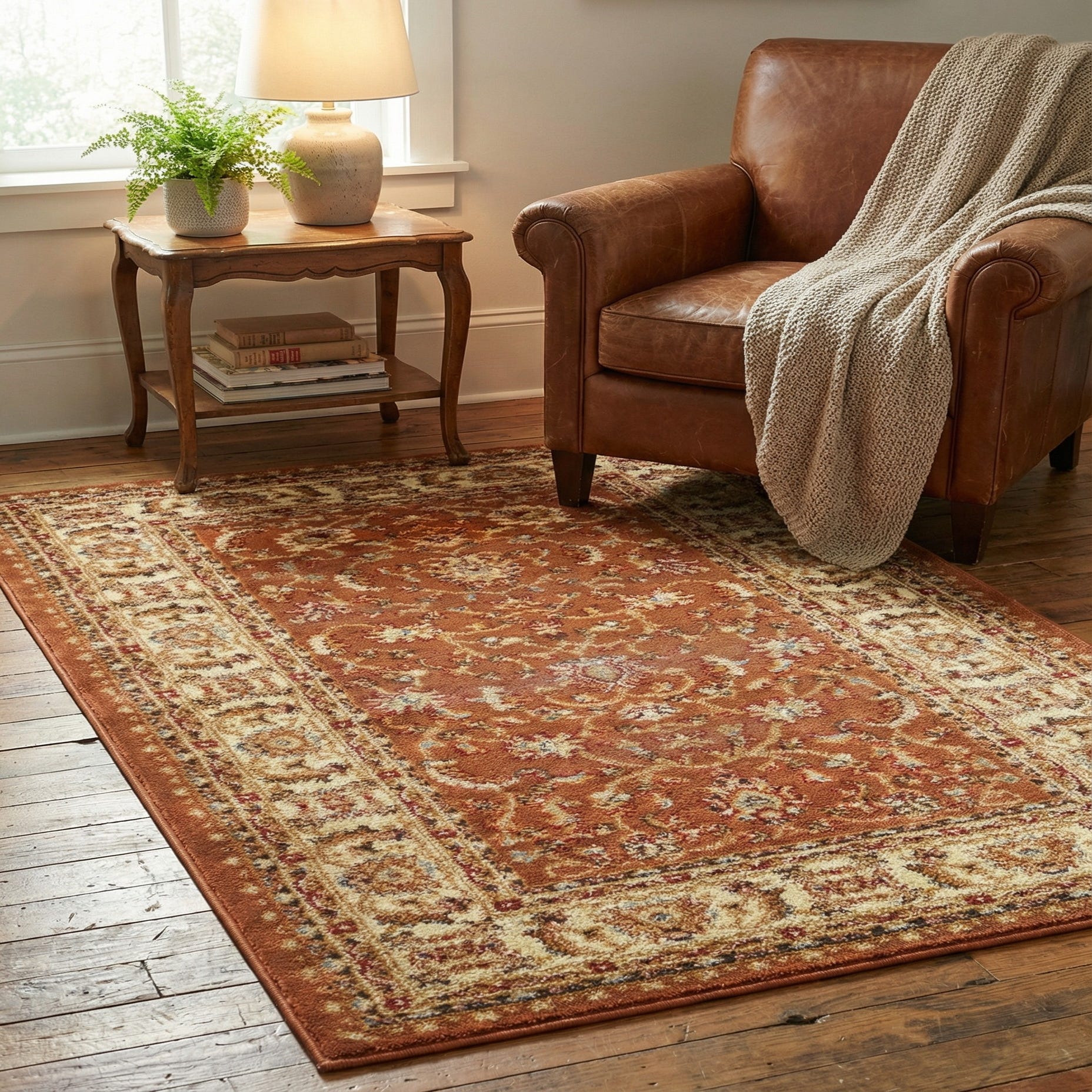 A classic Persian-inspired design unfolds across a warm Brick Red Light Rose field, anchored by scrolling floral motifs and an ornate cream border. Subtle accents of gray, green, red, tan and light blue are woven into the pattern, creating depth and gentle contrast against the rich background. Machine made of 100% polypropylene, the weave has a dense, soft pile that feels plush underfoot while holding the pattern’s crisp lines and color variation.