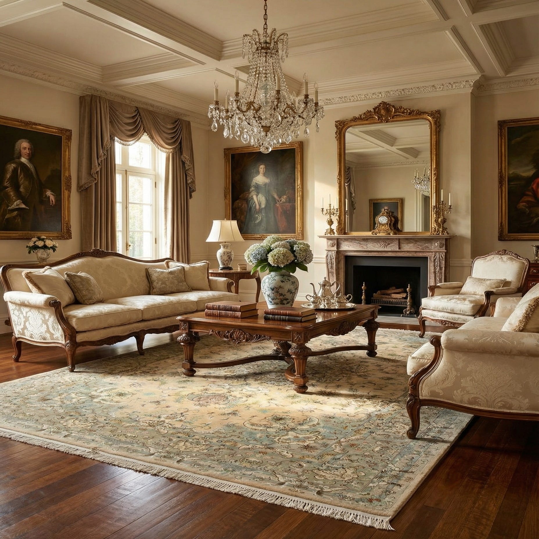 A rectangular 8x11 handmade Persian wool rug featuring a bright green and beige floral medallion pattern with an intricate border.