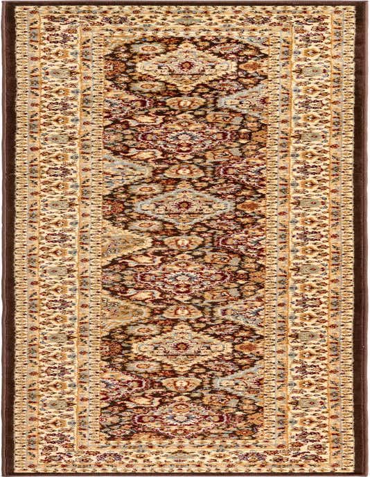 Primary color is Brown. Colors in this rug include: Brown, Cream, Light Blue, Light Green, Red, Tan, Peach.