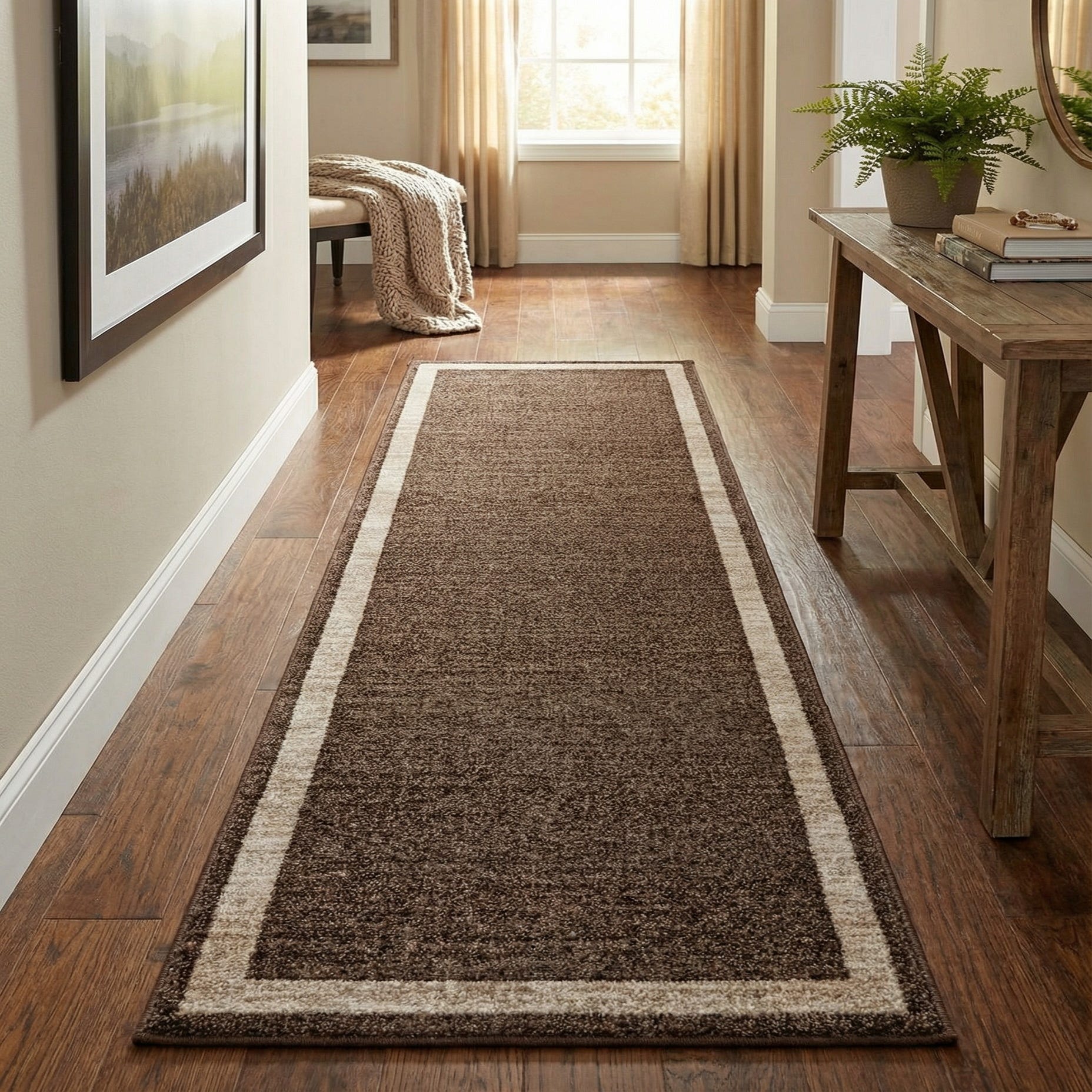 A simple, refined runner with a warm brown field bordered by a narrow ivory stripe and a slim darker-brown trim. The surface shows a subtle, multi-tonal texture that gives the rug visual depth while keeping the overall look restrained and clean. Machine-made from 100% polypropylene, the low-profile pile feels dense and smooth to the touch, offering a consistent surface that holds its shape through daily use.