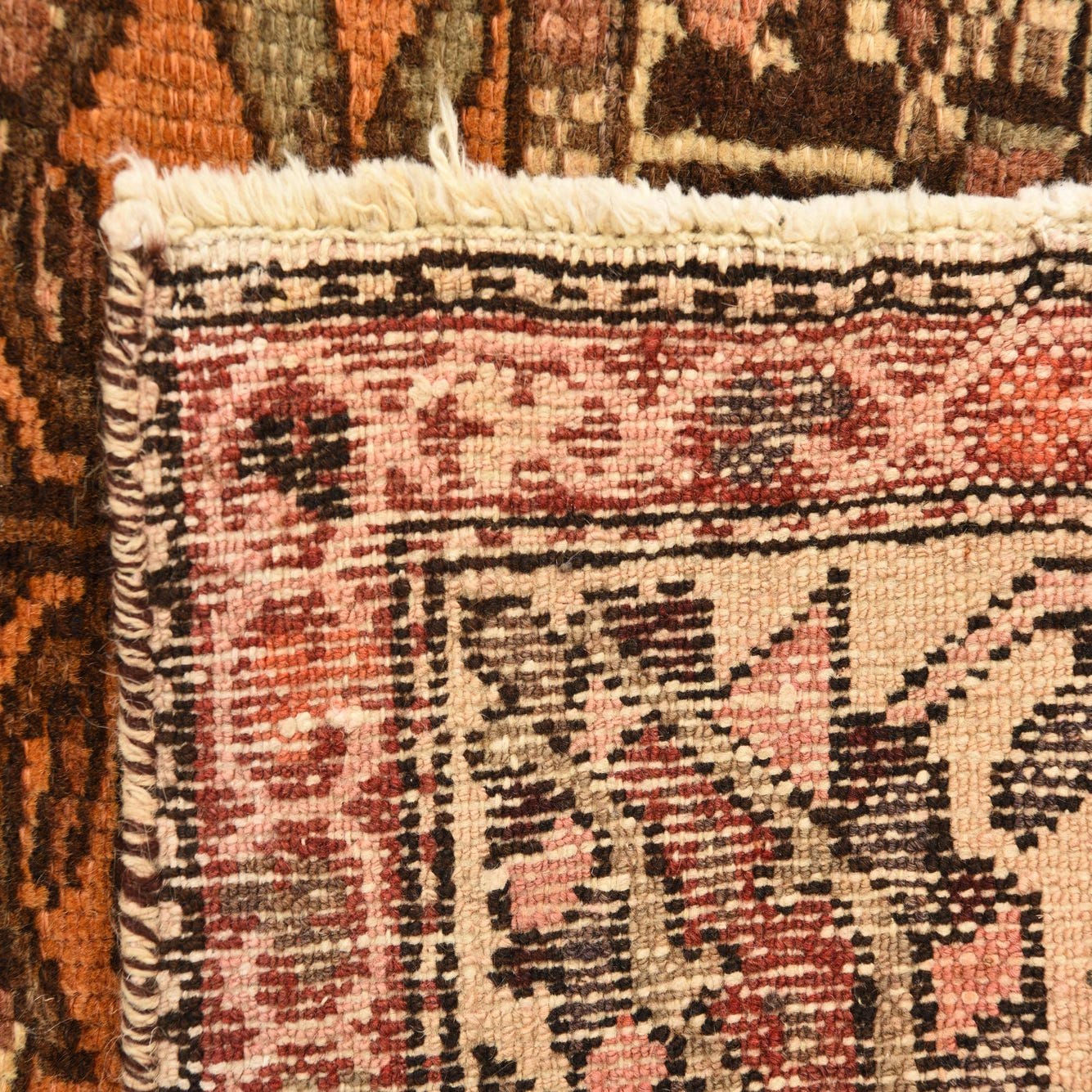 Primary color is Brown. Colors in this rug include: Brown, Ivory, Orange.