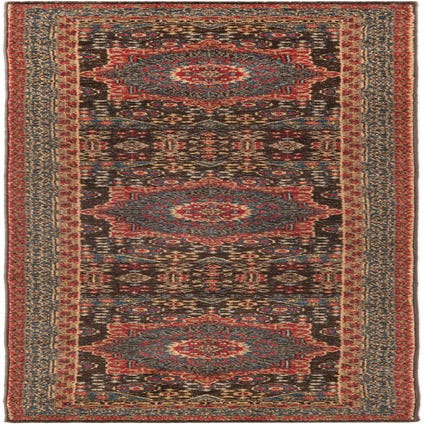 Primary color is Brown. Colors in this rug include: Brown, Beige, Blue, Light Blue, Red.