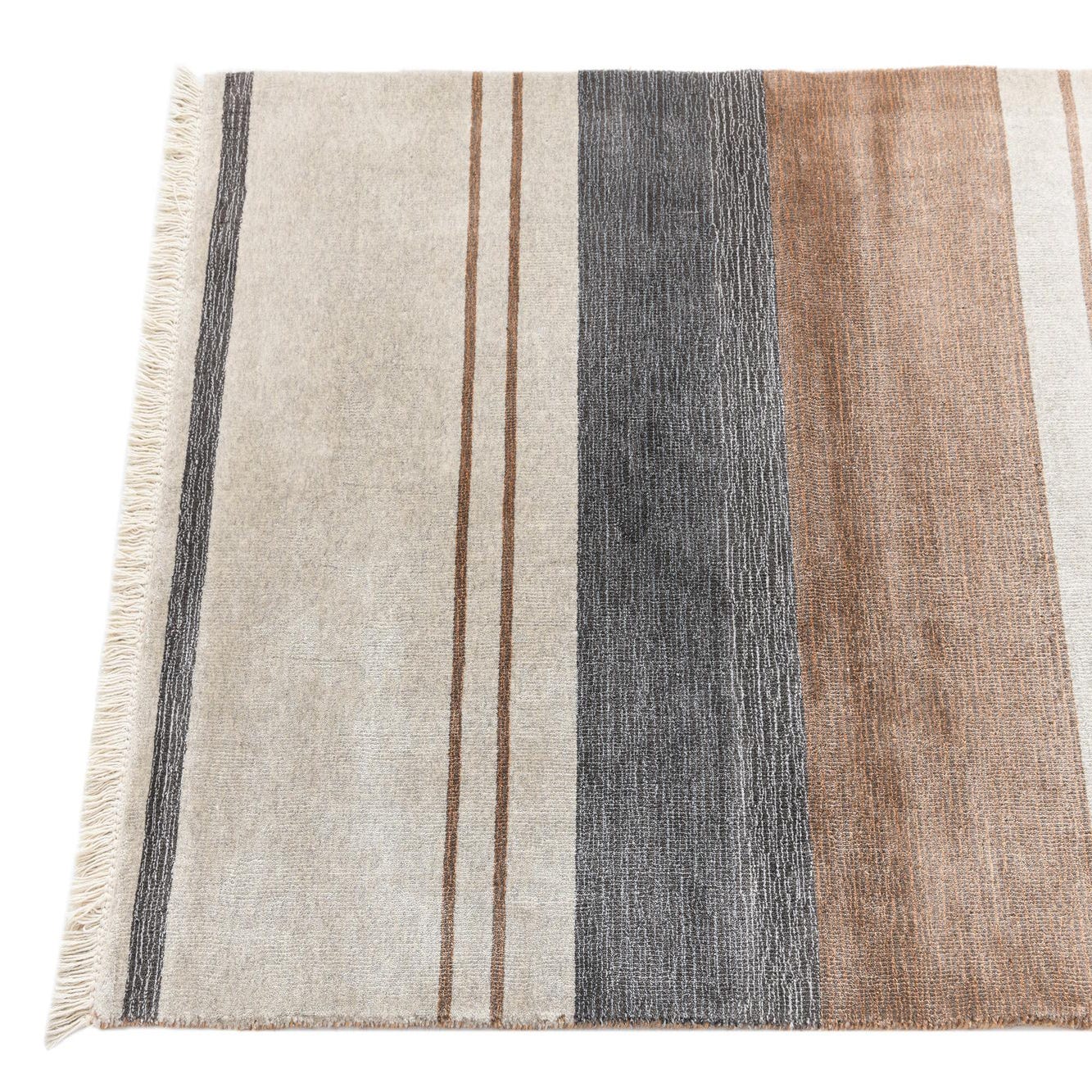 A 10 ft runner rug featuring wide horizontal stripes in varying shades of brown, tan, and gray, with fringed ends.