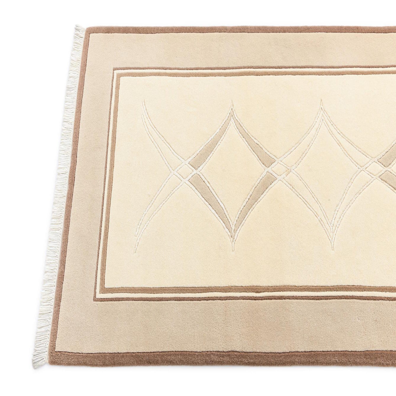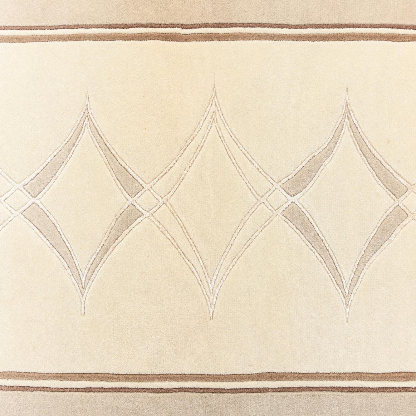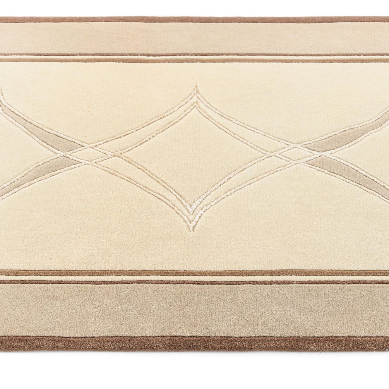 A long, narrow runner with a rich brown border framing a wide beige central field, this handmade wool and cotton rug pairs clean geometry with soft, tactile detail. A column of linked diamond motifs—rendered in light brown, tan and silver tones—travels down the center, with each diamond outlined in slightly raised stitching that gives a gentle, sculpted texture underfoot. The construction combines a wool pile with a cotton foundation, offering a pleasant, resilient surface and a refined, low-contrast look that highlights the tone-on-tone patterning.