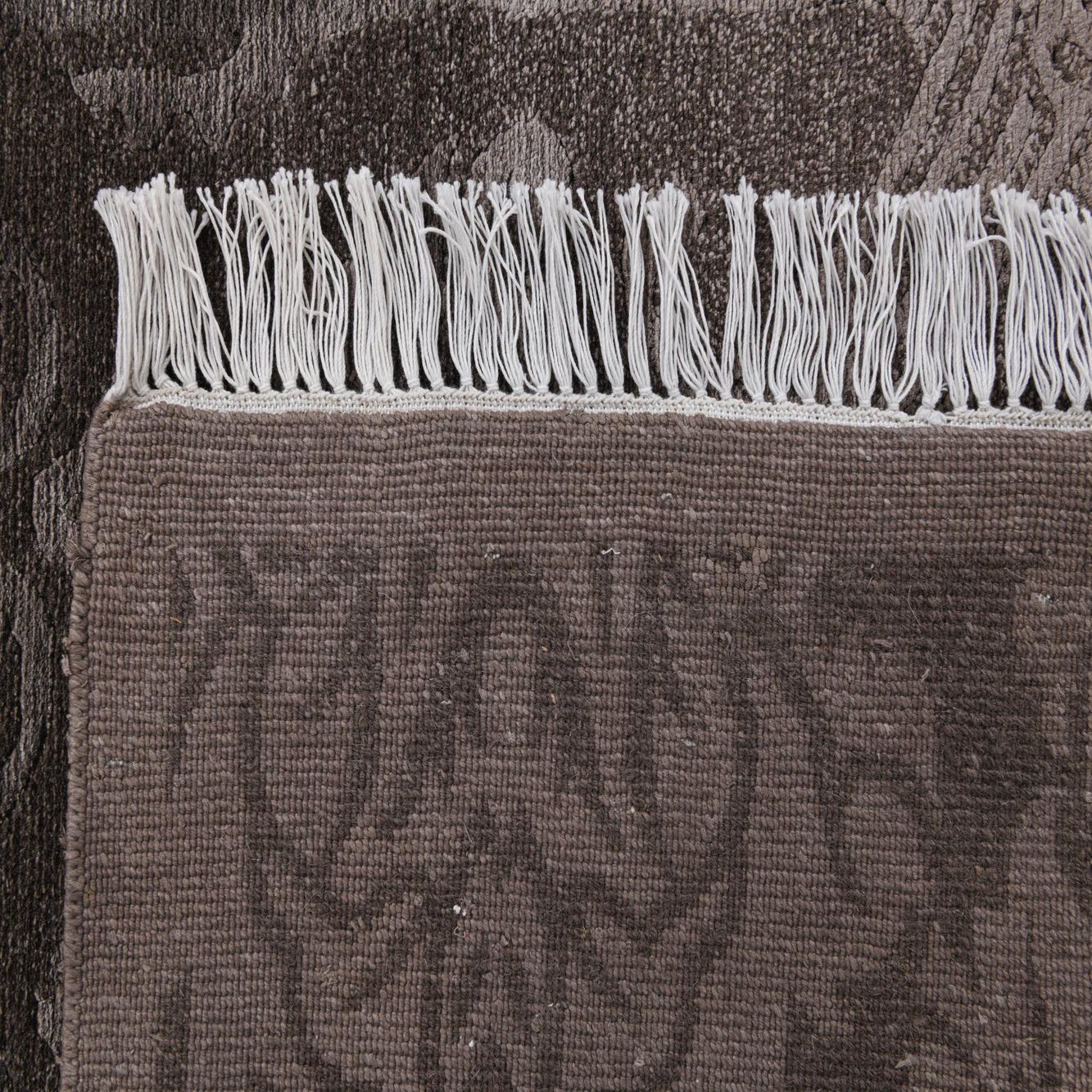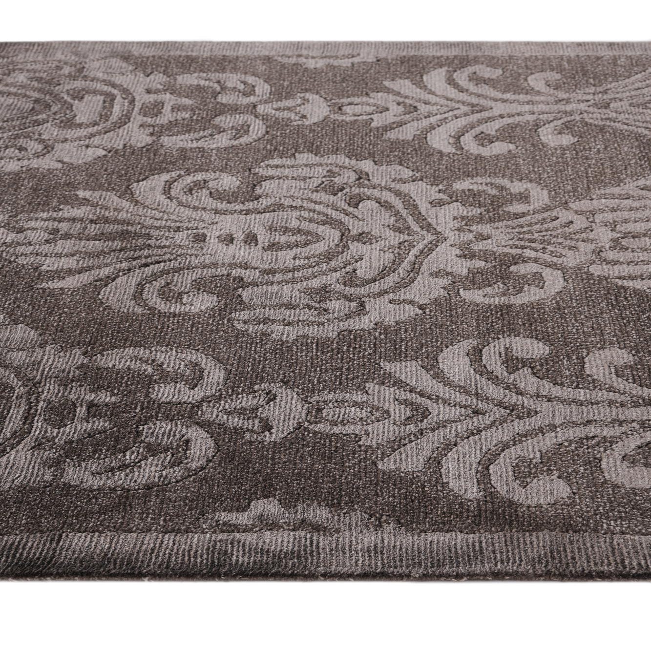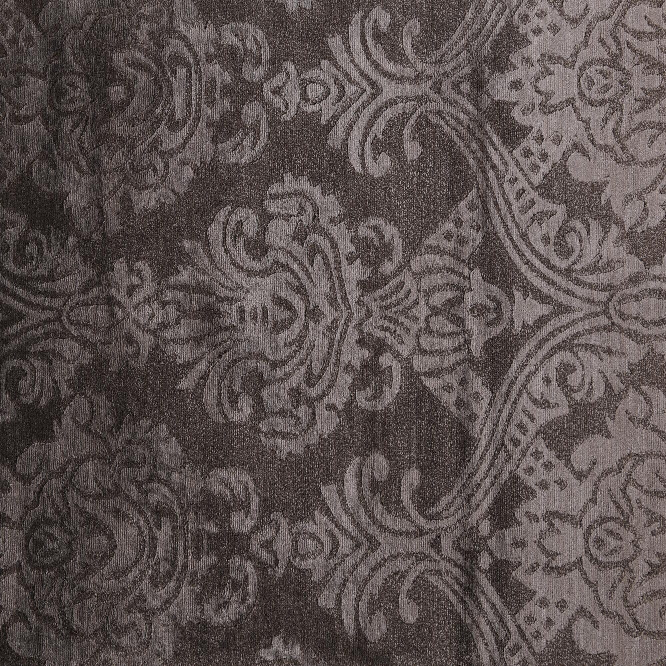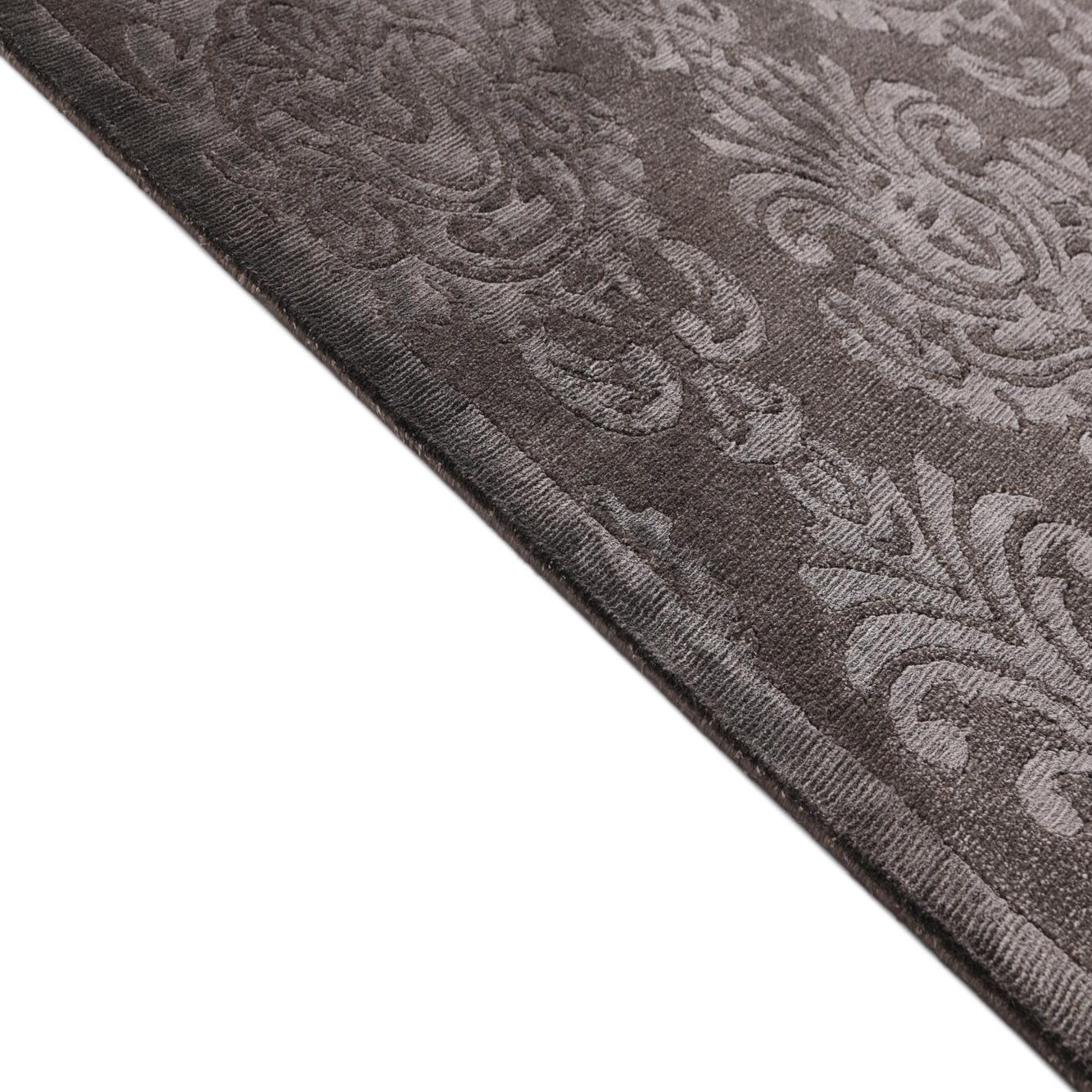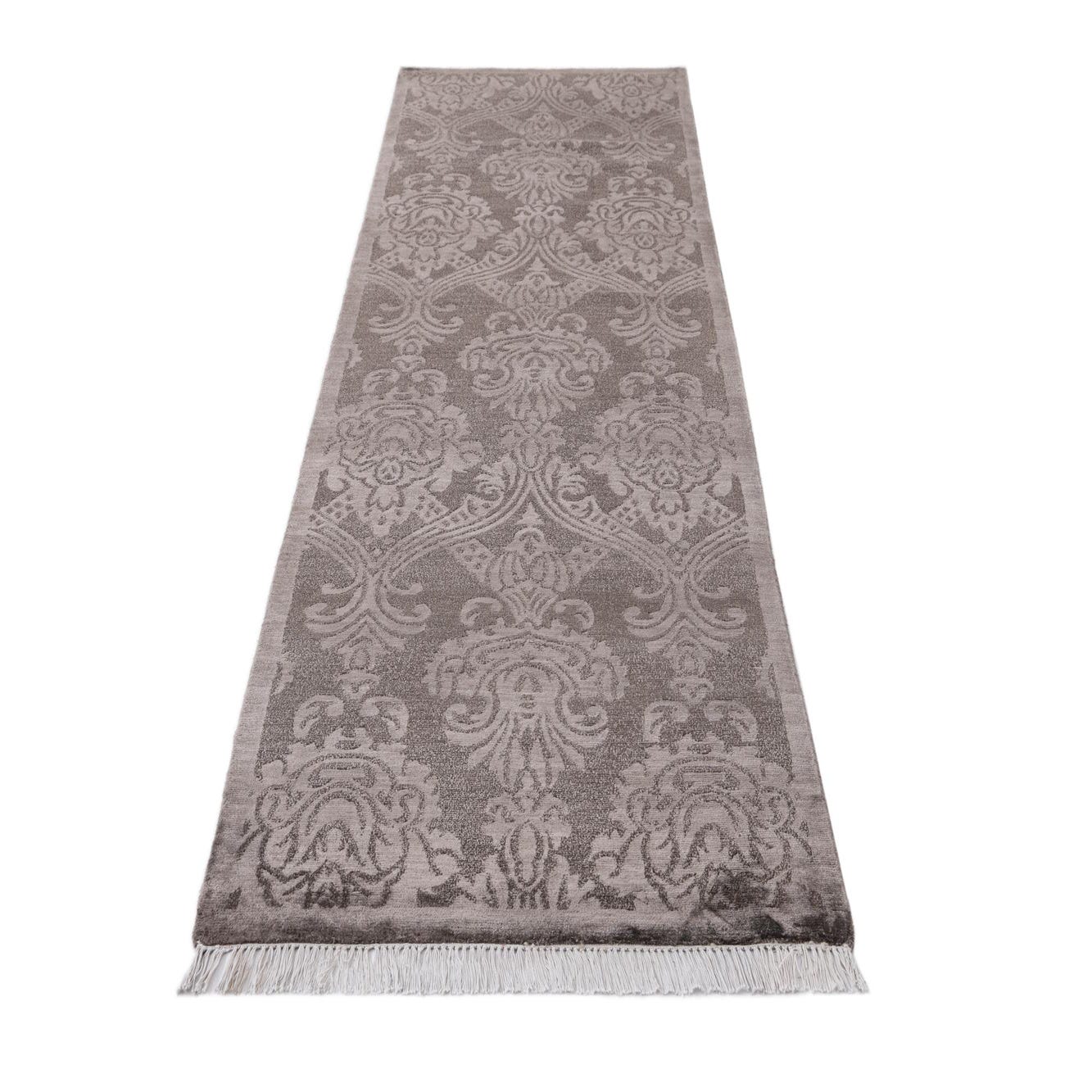 A 10 ft brown runner rug with a high pile and an elegant oriental pattern, featuring lighter tan damask motifs.