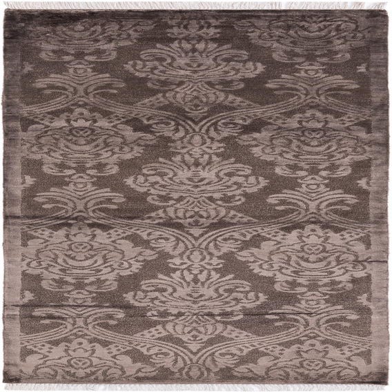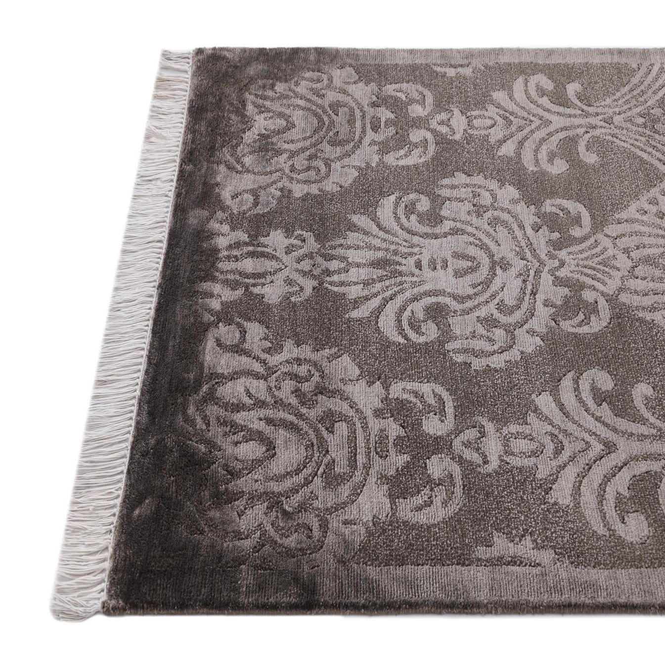 The rug showcases an intricate patterning with a harmonious blend of brown and light brown hues, grounded on a brown background. The classical design elements depict floral and foliate motifs arranged in a mirrored layout that imbues a sense of symmetry and order.