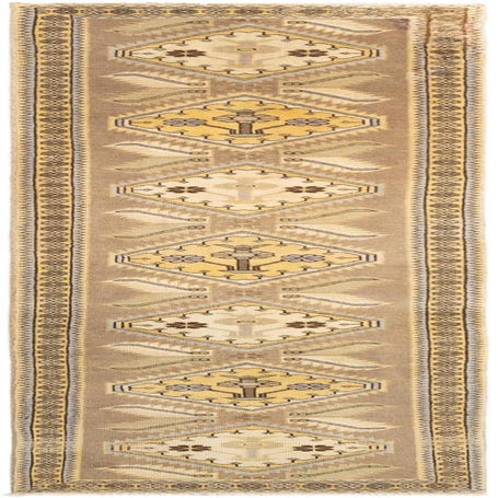 Primary color is Brown. Colors in this rug include: Brown, Yellow, Cream, Light Blue.