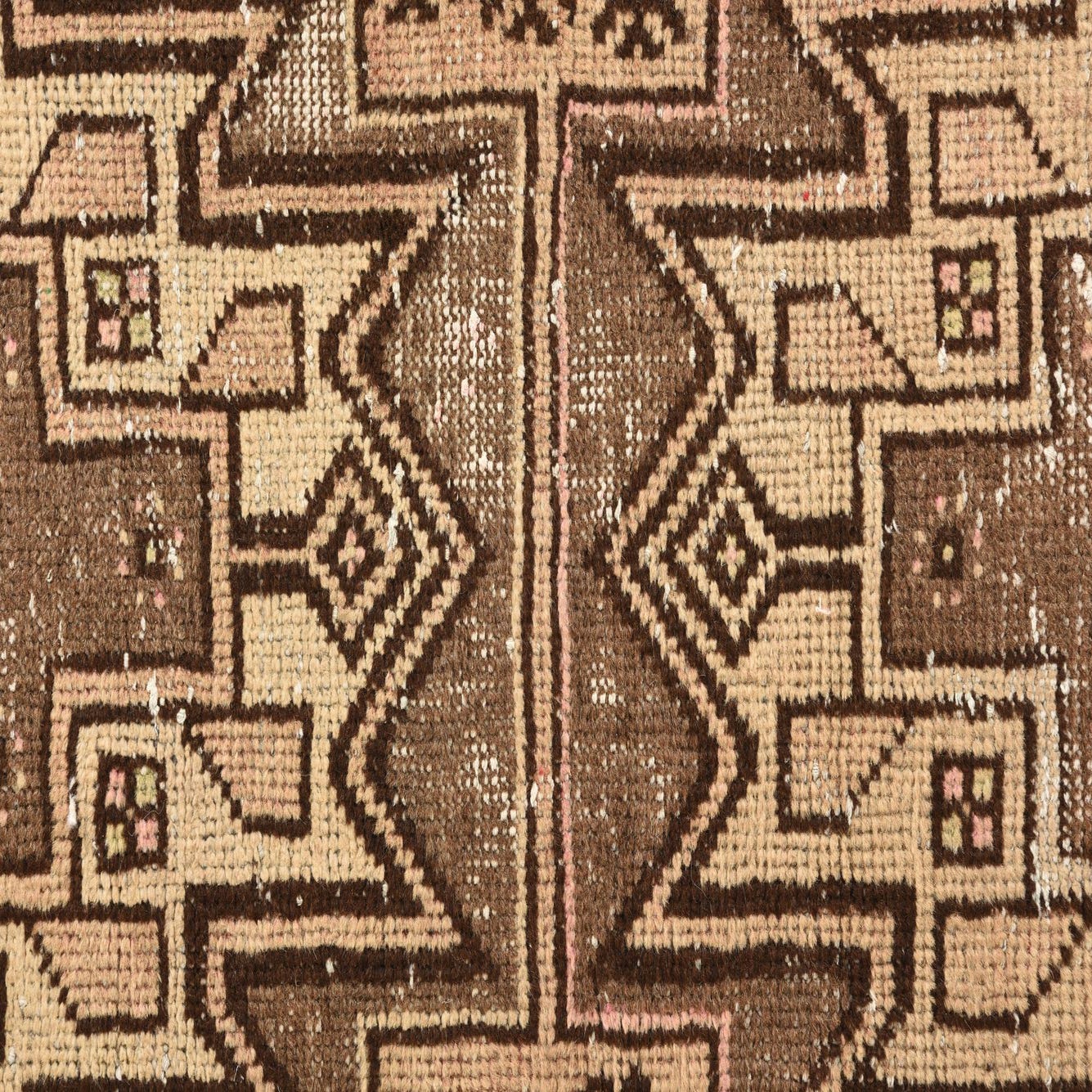 A 10 Ft Hamedan runner rug in browns and tans, featuring a distressed Persian tribal pattern, ideal for a hallway.