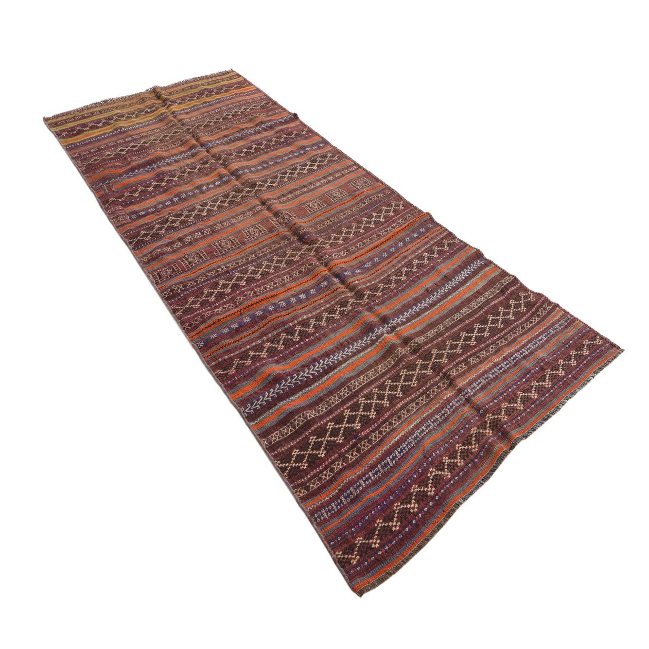 A 10 Ft Runner Kilim Fars rug with a tribal Persian stripe pattern in browns, tans, oranges, and purples, suitable for a hallway.