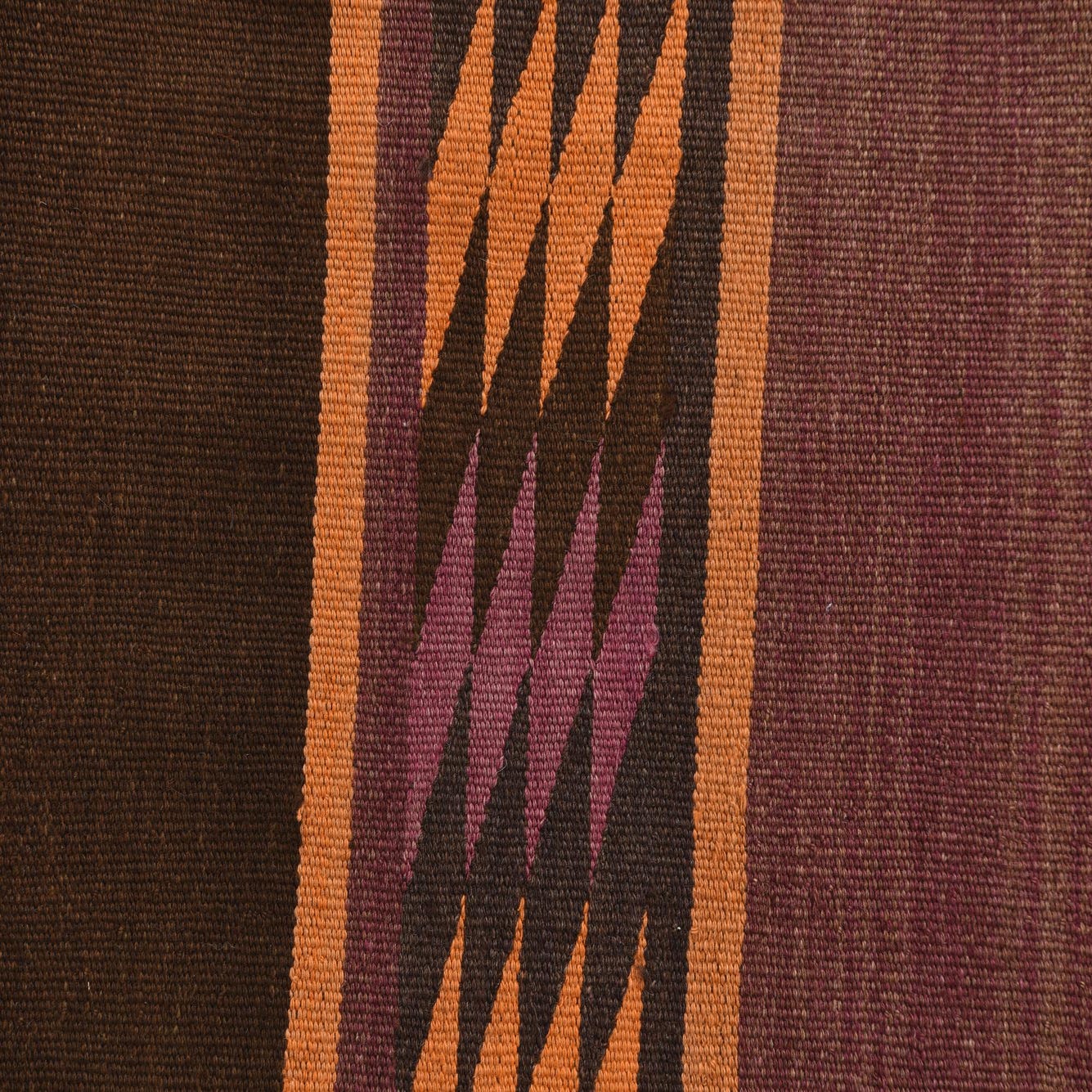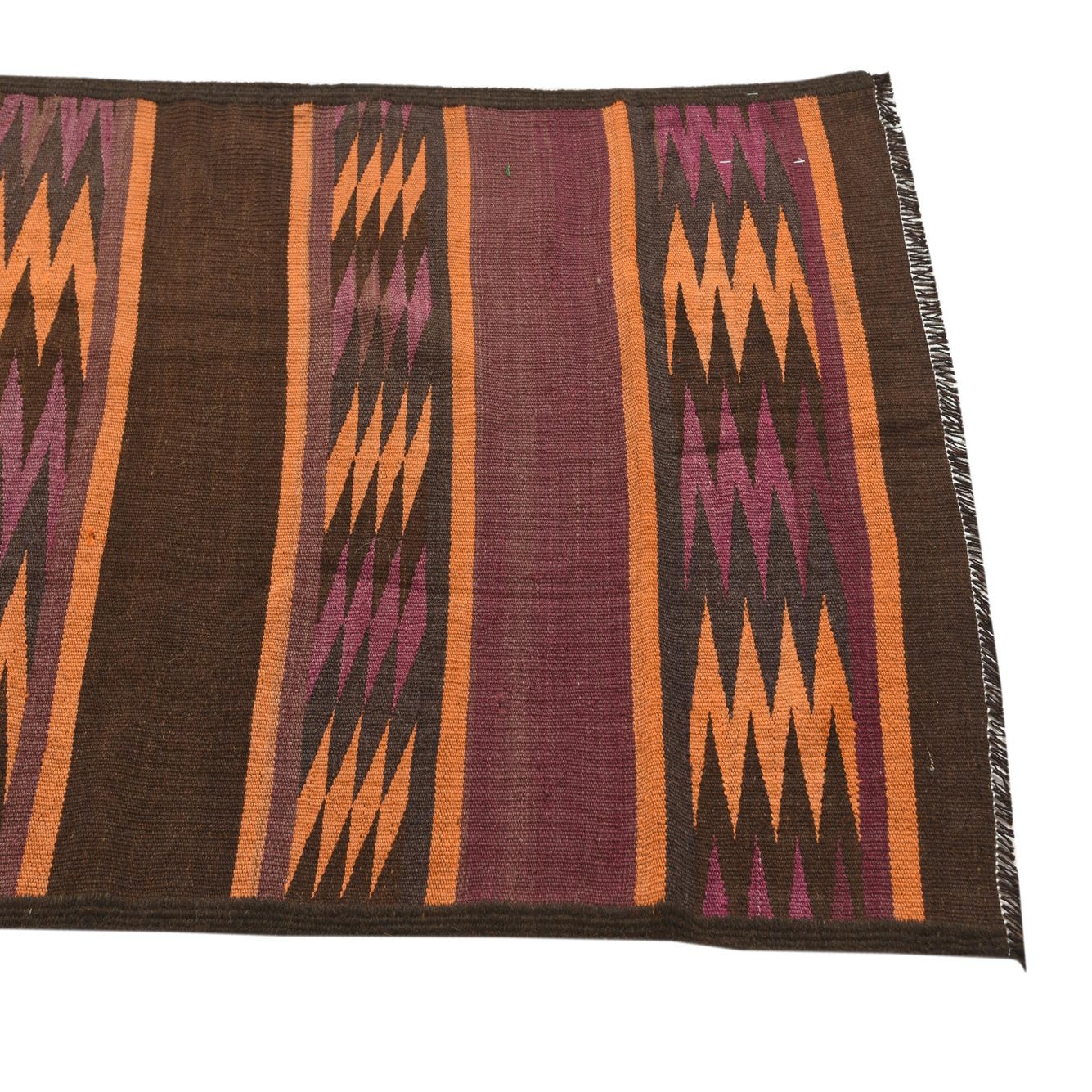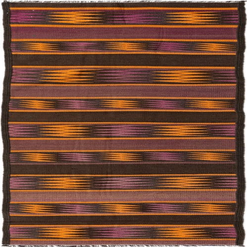 Primary color is Brown. Colors in this rug include: Brown, Orange, Purple.