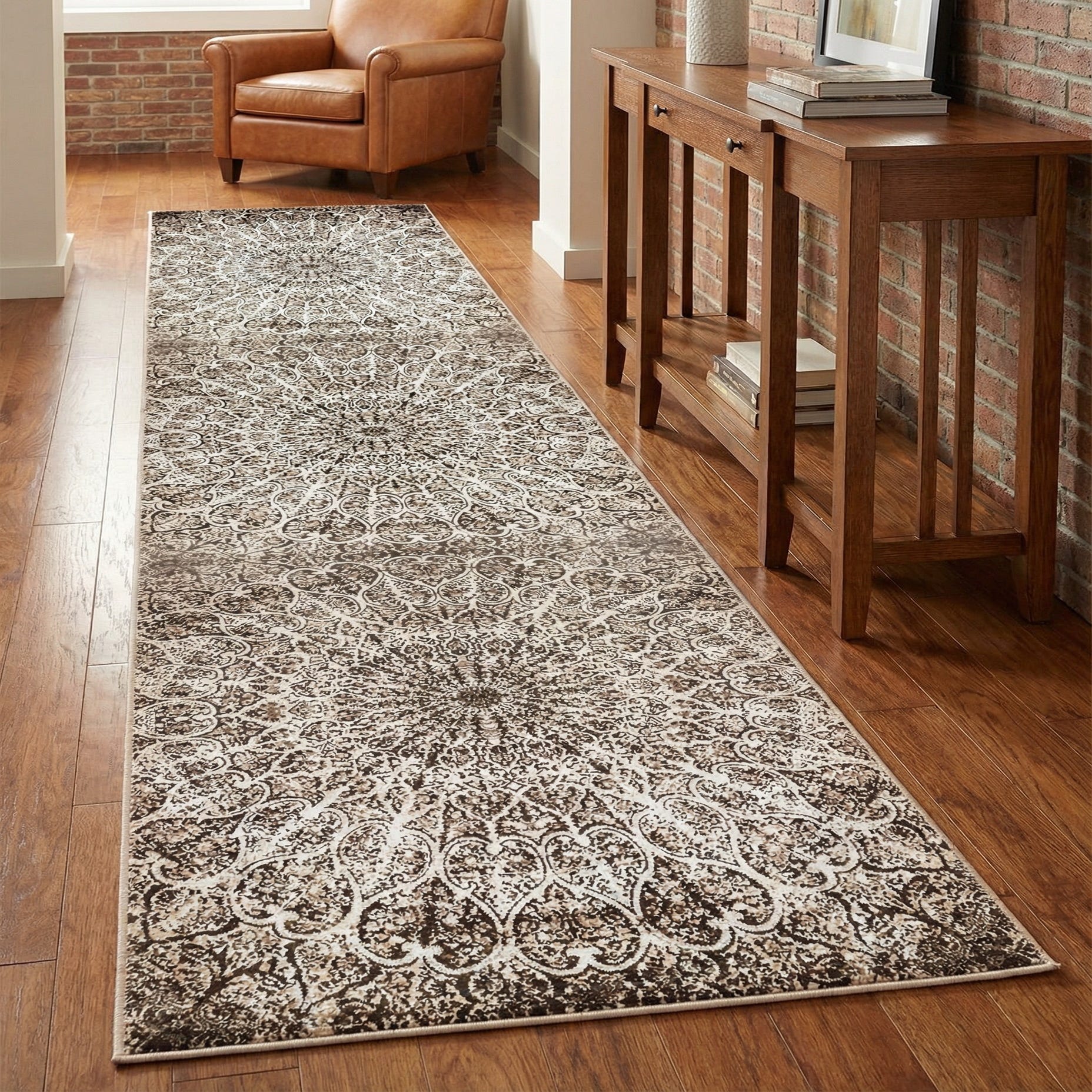 Machine-made from 100% polypropylene, the rug has a low, smooth pile that feels close-cropped yet comfortable underfoot. It works well in a long entryway or hallway where the pattern can play out along the run, or alongside a bed in a bedroom to add pattern without overwhelming the space. The brown and ivory palette pairs nicely with wood tones and neutral upholstery, and fits traditional, transitional, or farmhouse-inspired interiors that benefit from a patterned foundation.