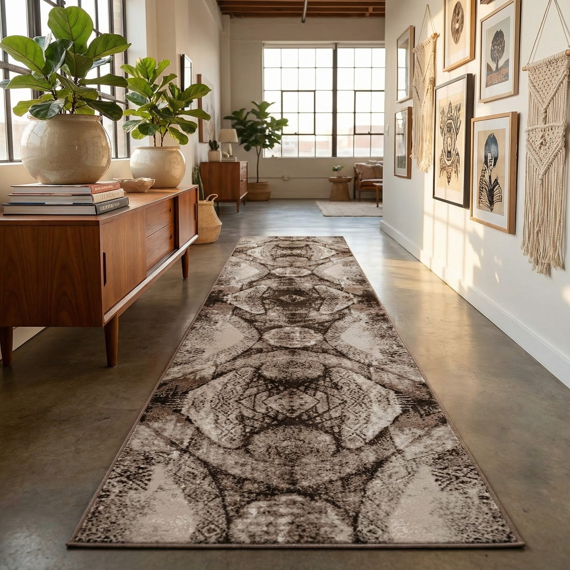 This runner's versatile design effortlessly complements minimalist, modern, and even industrial decor themes. It would align well in a sleek urban loft or a chic contemporary home, bringing character to hallways or transitional spaces between rooms. The elegant color scheme can be paired with natural wood elements, clean lines in furniture, and neutral tones to create a balanced and refined space.