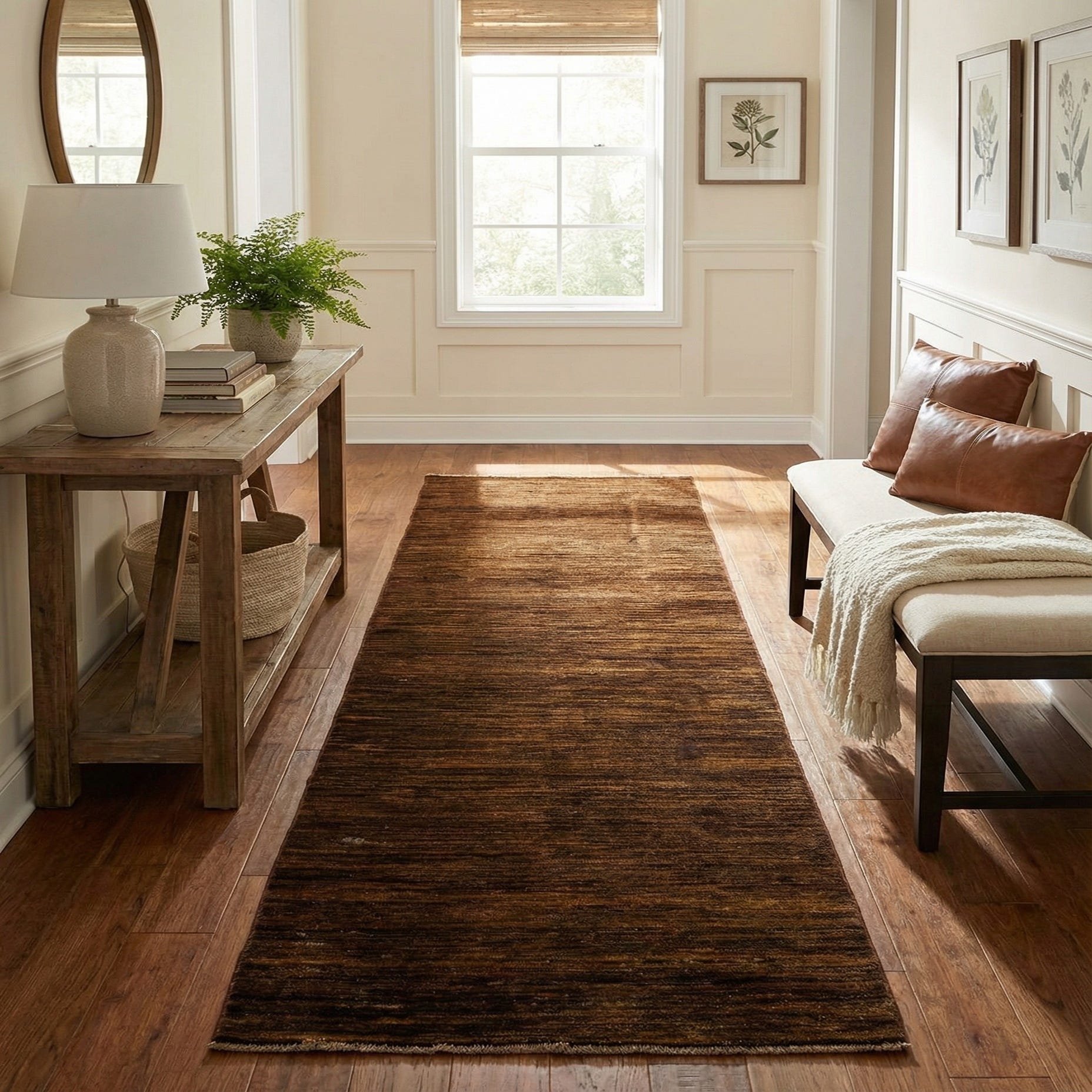This runner works well in entryways and hallways where a long, narrow grounding element is needed, and it layers nicely under a console table or along a kitchen aisle. Its warm brown palette and clean linear style complement mid-century modern, contemporary rustic, and transitional interiors, adding tactile warmth to corridors, stair landings, or office walkways.