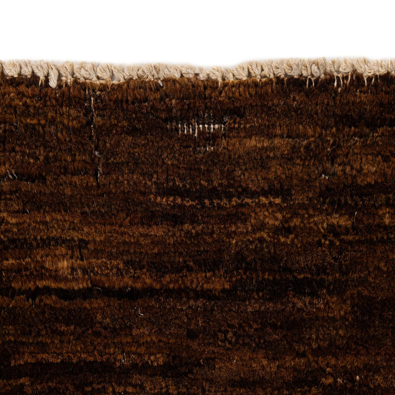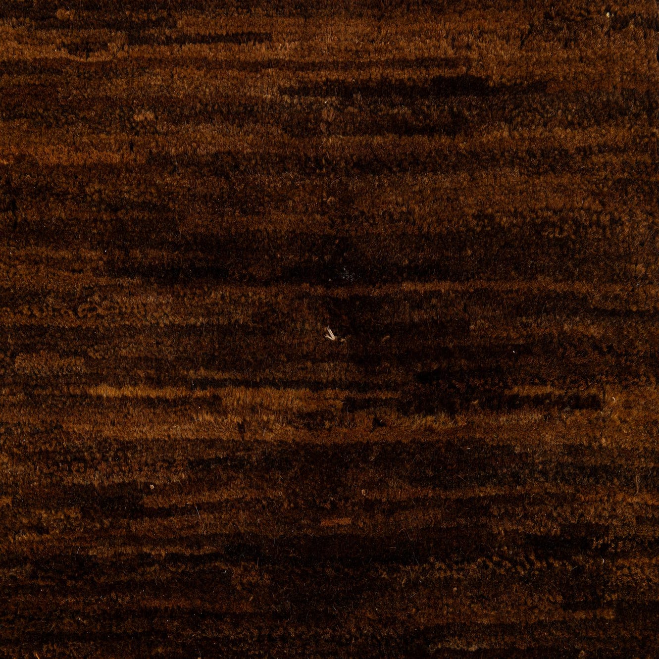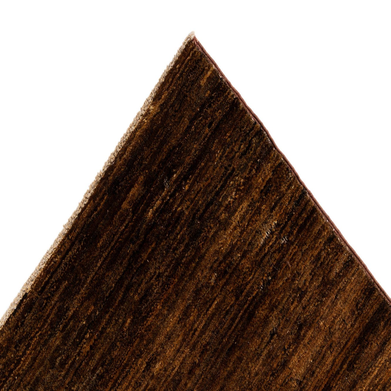 A warm brown field with subtle light-brown striations creates a simple, linear pattern across this hand-knotted runner. Woven from 100% hand-spun wool, the pile has a soft, slightly velvety texture and a gentle luster from the natural fibers. The tonal striping is understated and irregular, giving the runner a handcrafted character while keeping the overall look contemporary and restrained.