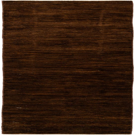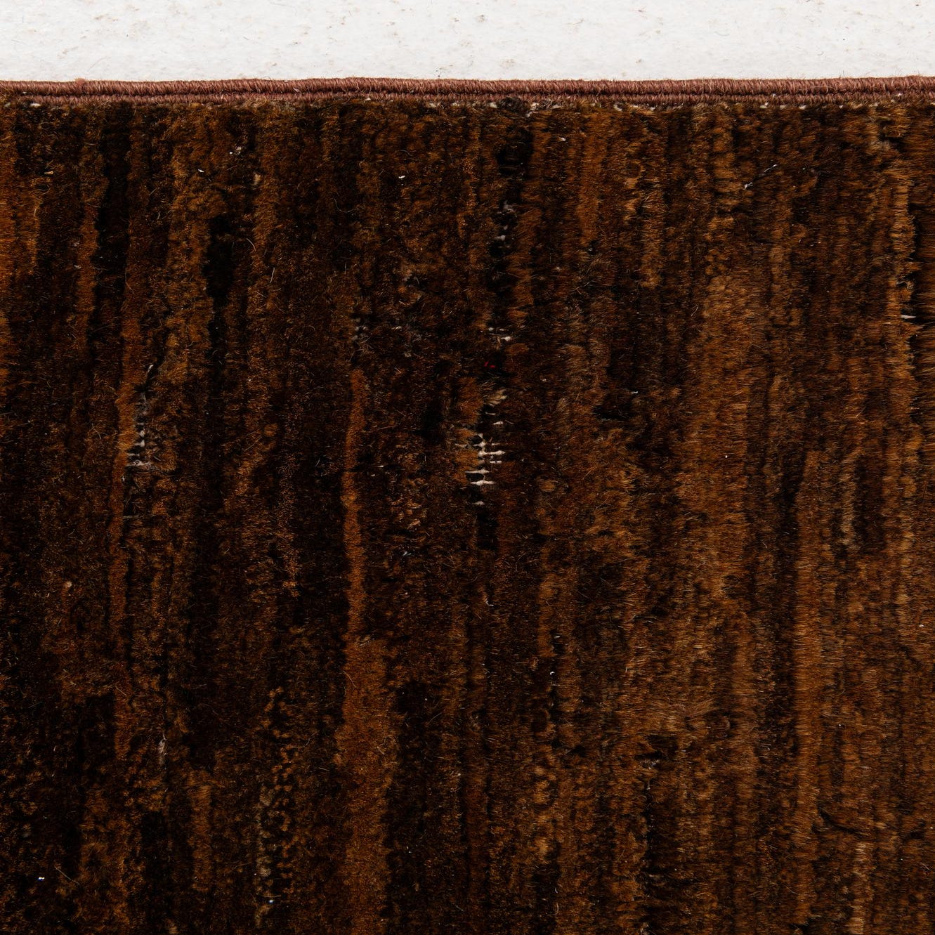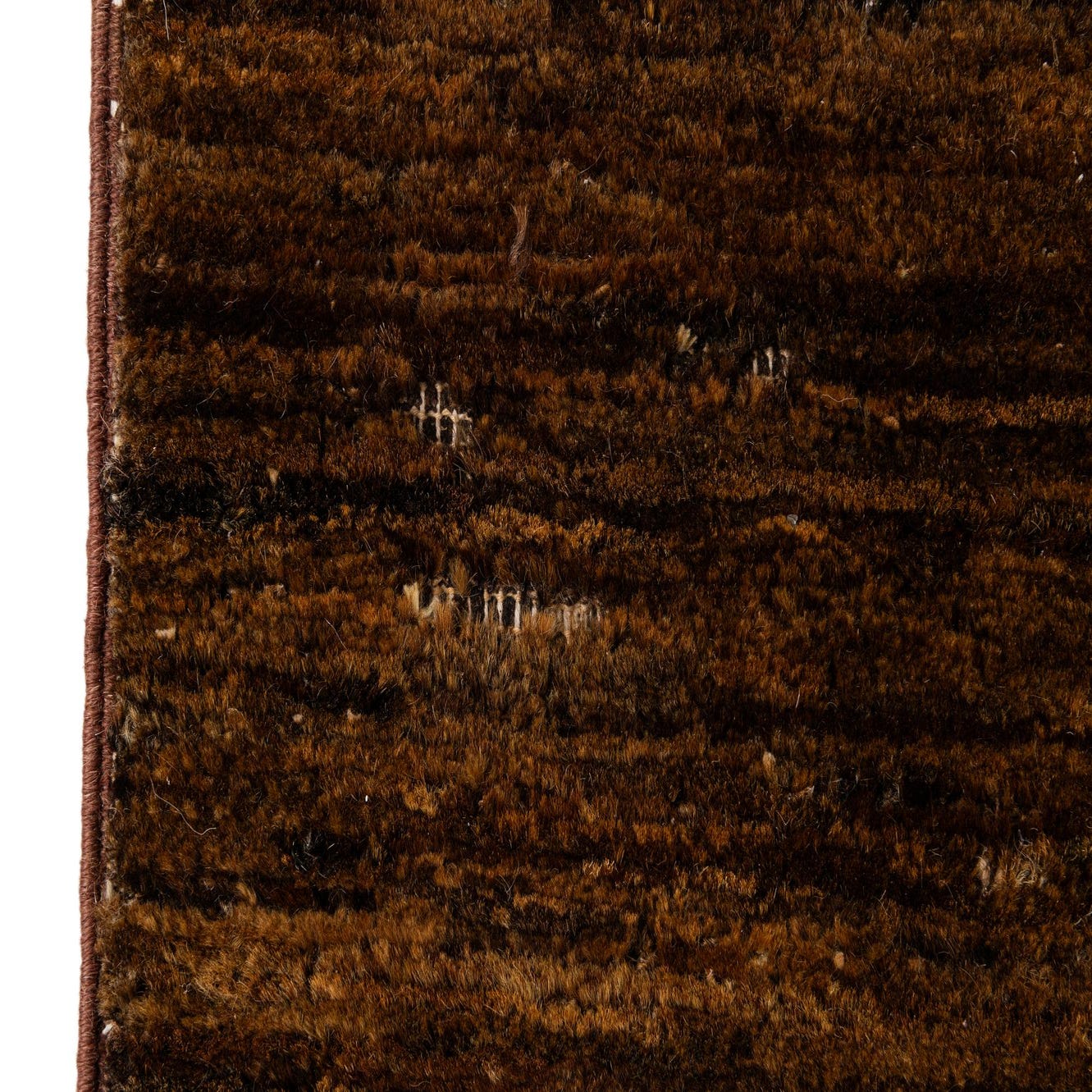 A warm brown field with subtle light-brown striations creates a simple, linear pattern across this hand-knotted runner. Woven from 100% hand-spun wool, the pile has a soft, slightly velvety texture and a gentle luster from the natural fibers. The tonal striping is understated and irregular, giving the runner a handcrafted character while keeping the overall look contemporary and restrained.