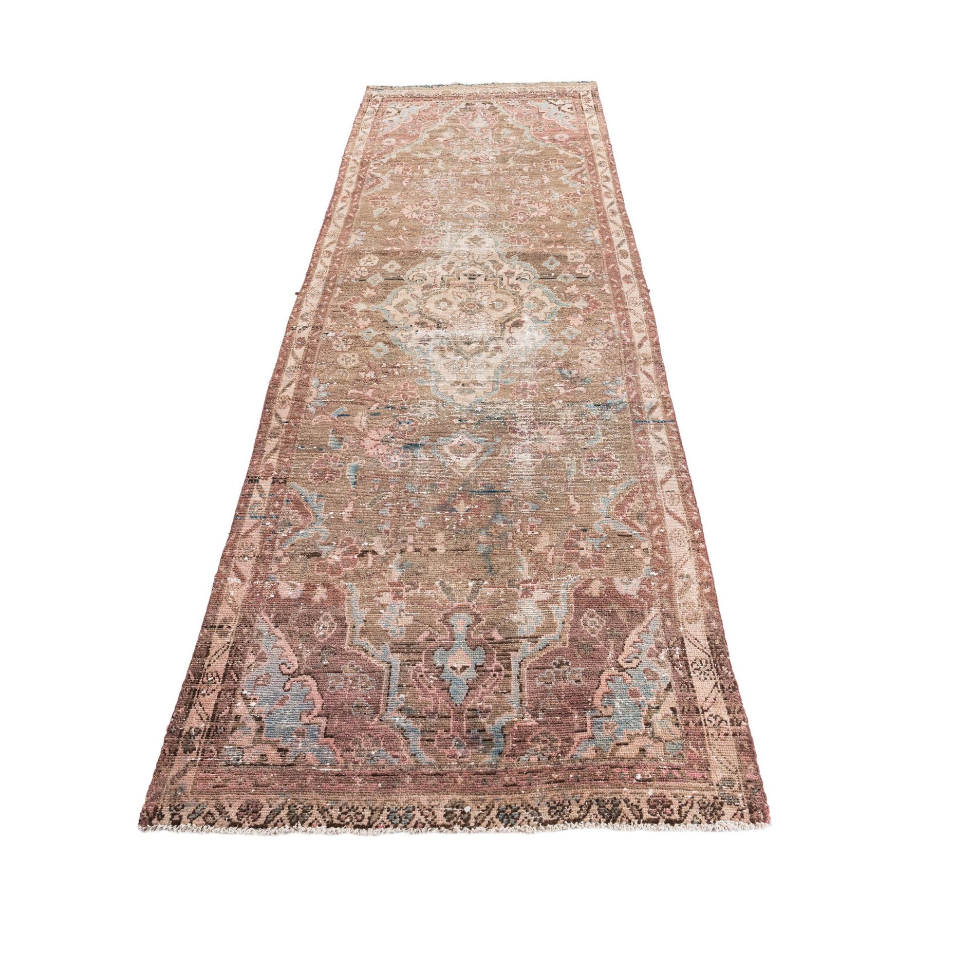 A 10 ft runner rug in brown and tan with a distressed Persian pattern, featuring hints of pink and blue.