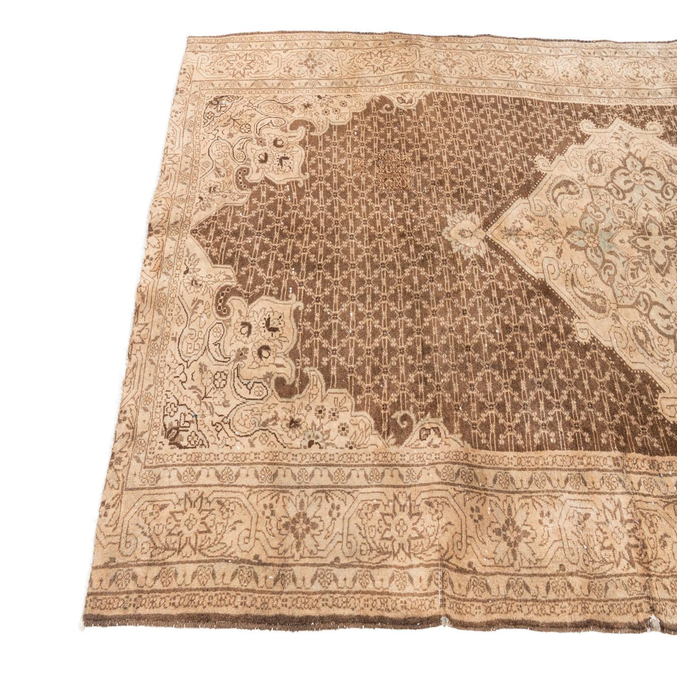 A 10 ft runner rug in brown and tan, featuring a distressed Persian medallion pattern and ornate border, ideal for a hallway.