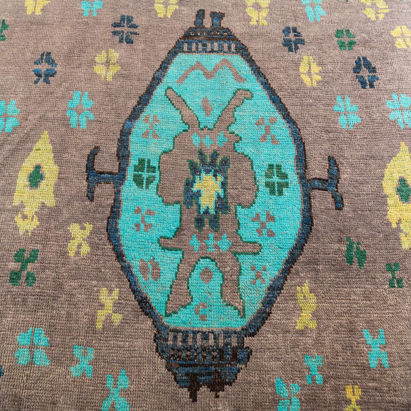 A 10x12 rectangular brown tribal wool shag rug with two large turquoise medallions and scattered colorful floral motifs.