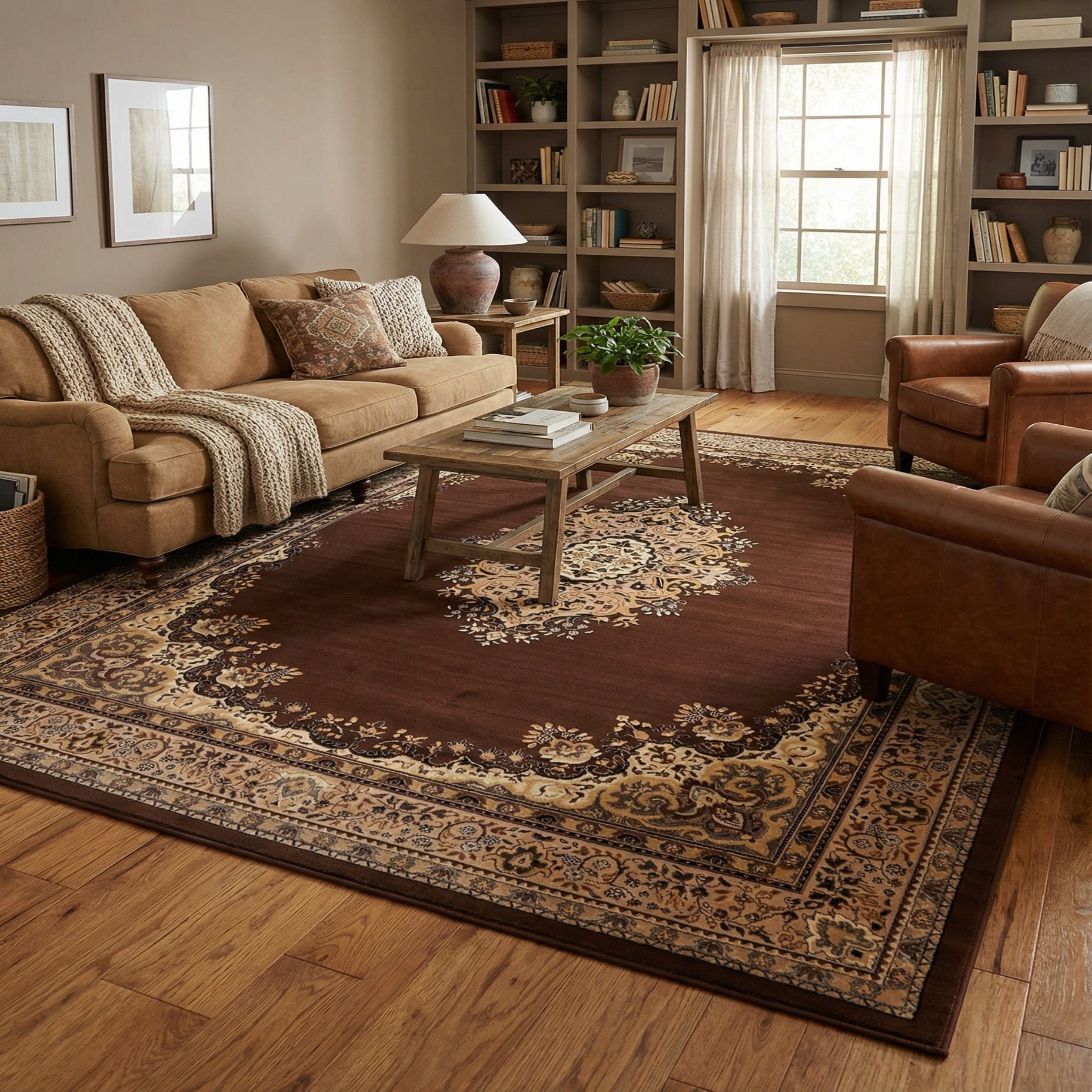 A centered medallion and layered floral border create a classic, Oriental-inspired look that brings structure to the room. The warm brown field provides a rich backdrop for ornate scrollwork and floral motifs worked in cream, tan and black, with decorative corner spandrels that frame the design. Running your hand over the surface reveals a low, even pile with a smooth, slightly dense feel that highlights the pattern without adding bulk underfoot.