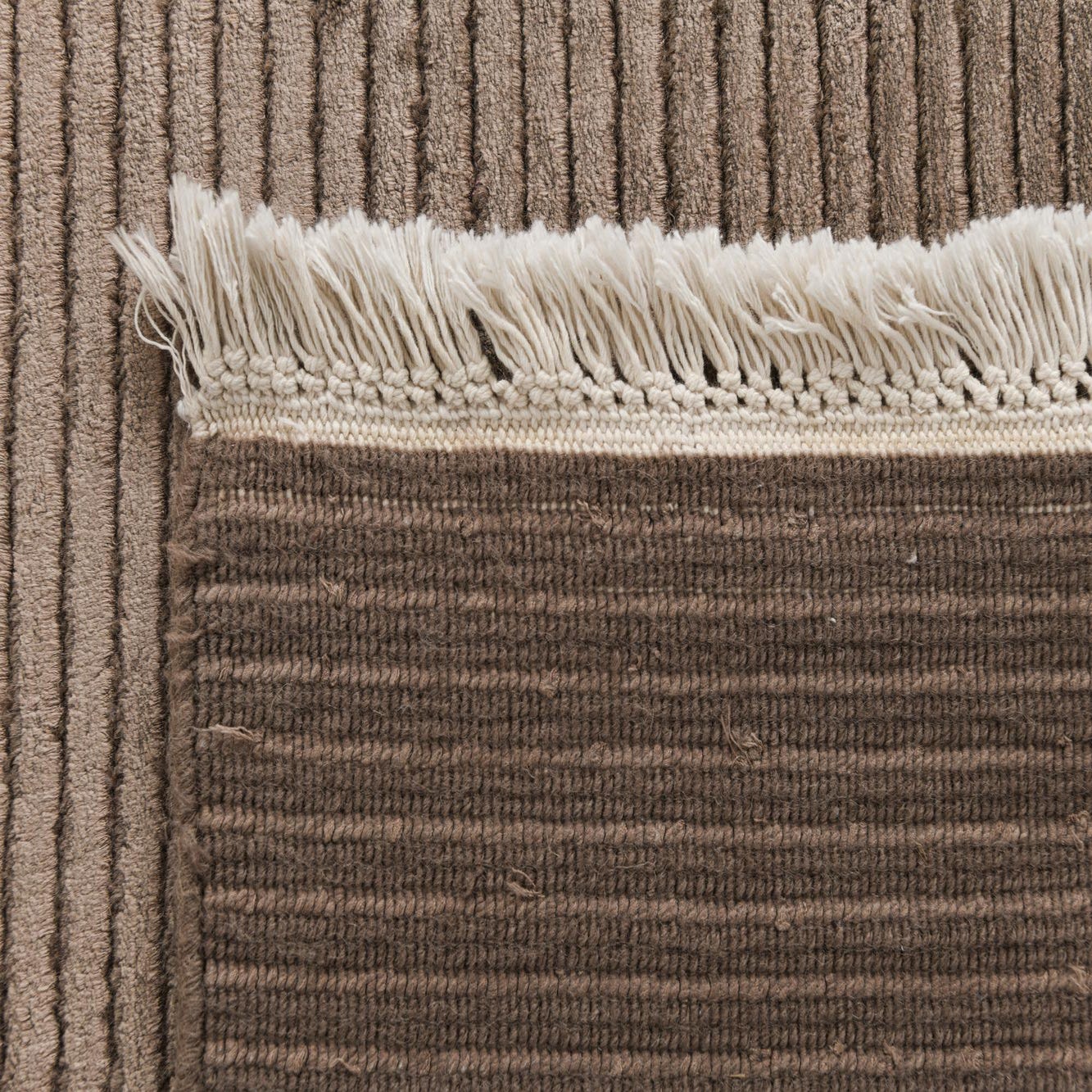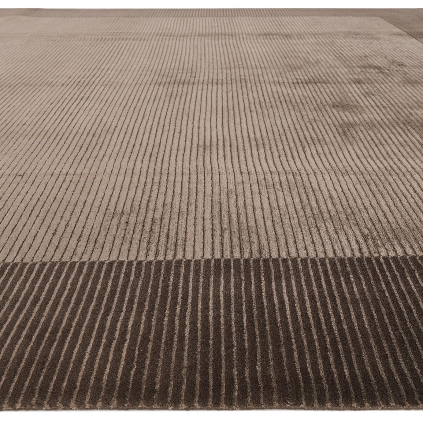 A 10x13 rectangular Darya rug in varying shades of brown and tan, featuring a modern striped pattern and a high pile.