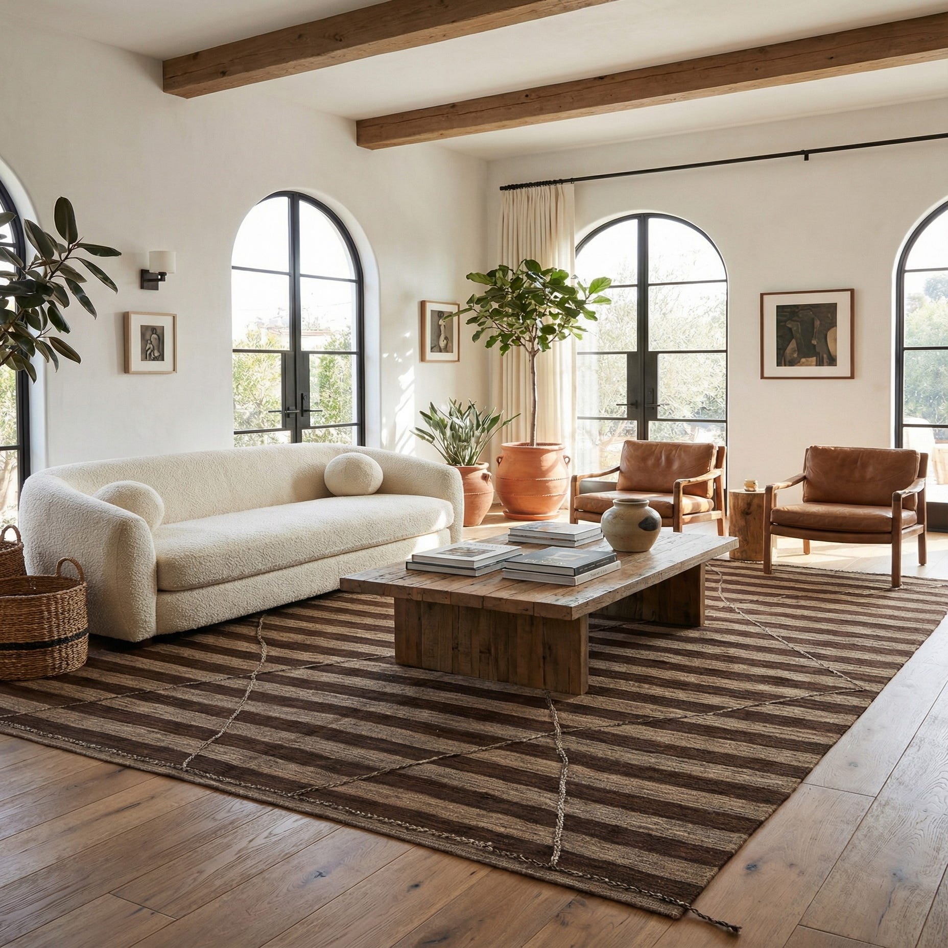 A 10x13 rectangular Moroccan shag rug with alternating dark brown and tan stripes, overlaid with a diamond pattern.