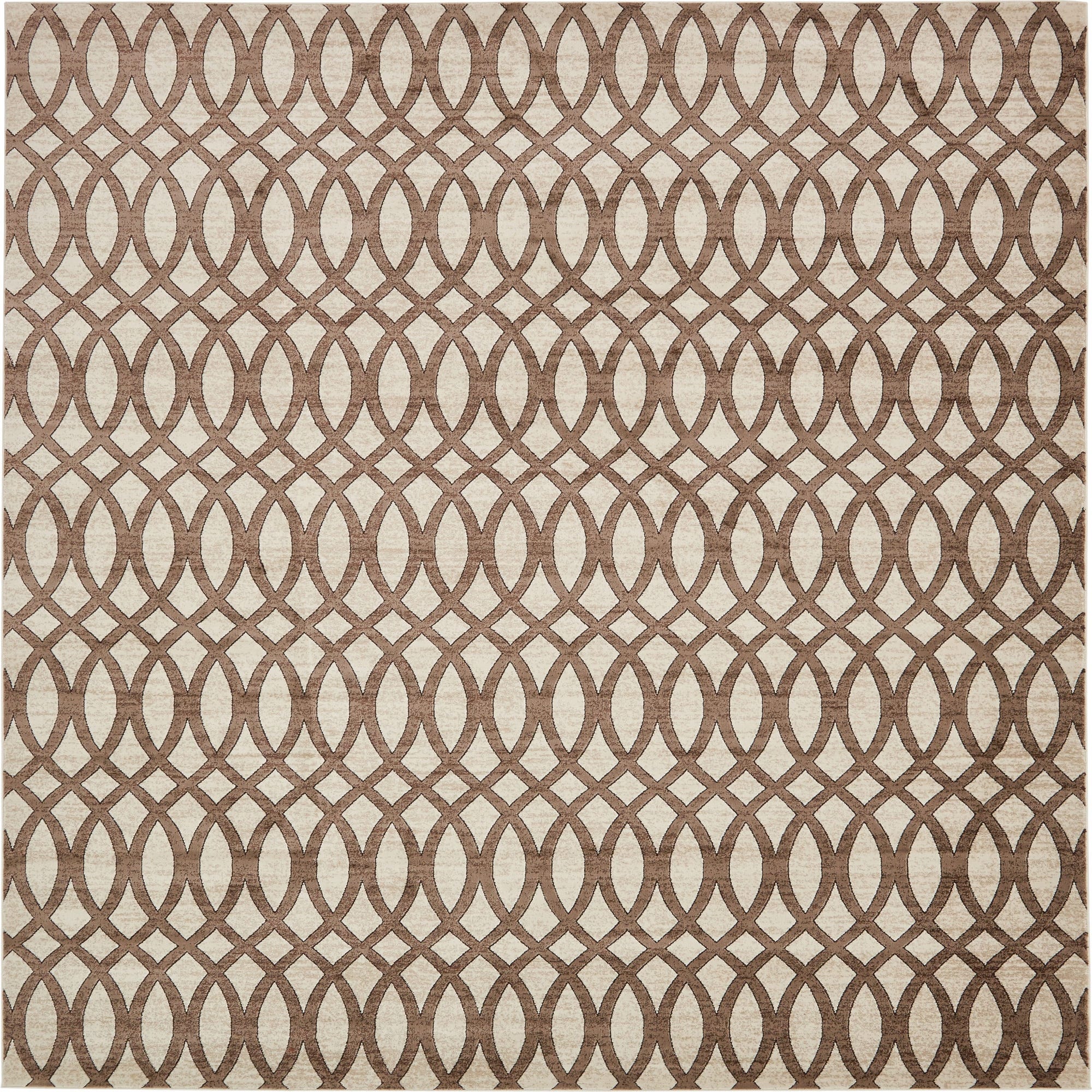 A repeating interlocking-oval trellis gives this rug a structured, geometric look with a nod to traditional motifs rendered in cleaner lines. Beige and light brown patterning sits against a warm brown ground, creating layered contrast that reads as both grounded and visually engaging. The balanced motif works equally well in modern, transitional, or classic-inspired interiors.