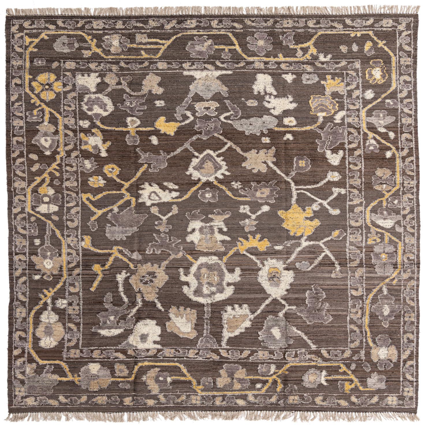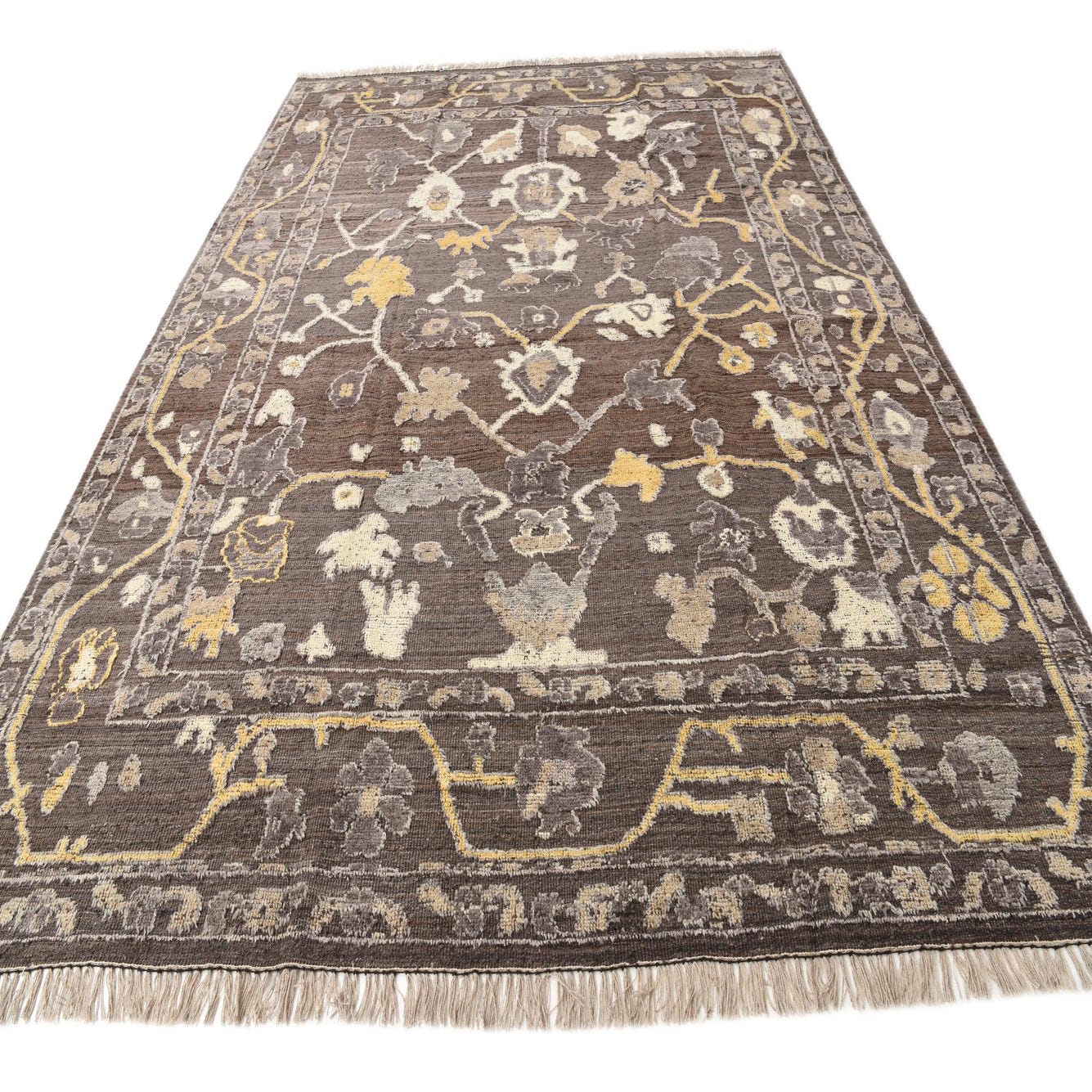 A 10x13 rectangular Oushak rug in browns and tans with an abstract floral pattern and fringe.
