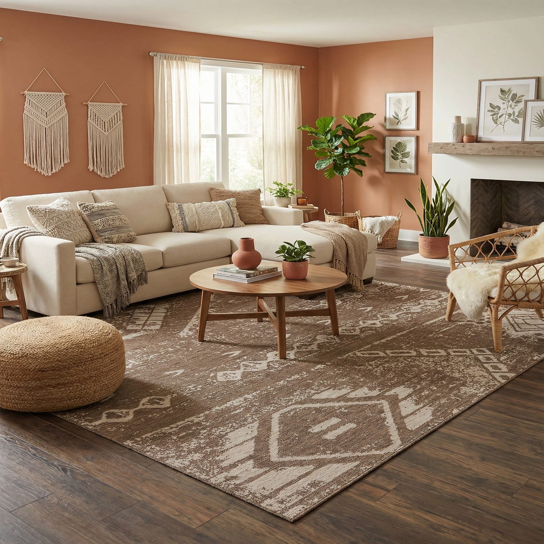 This piece is notably pet-friendly, accommodating for homes with pets without compromising on style or longevity. The design embraces an unpretentious bohemian vibe, with a pattern that suggests a hand-drawn quality, bringing an eclectic and personal touch to spaces. The brown background anchors the design, while the ivory accents offer a gentle contrast, ensuring this rug is versatile enough to integrate into a variety of décor schemes.