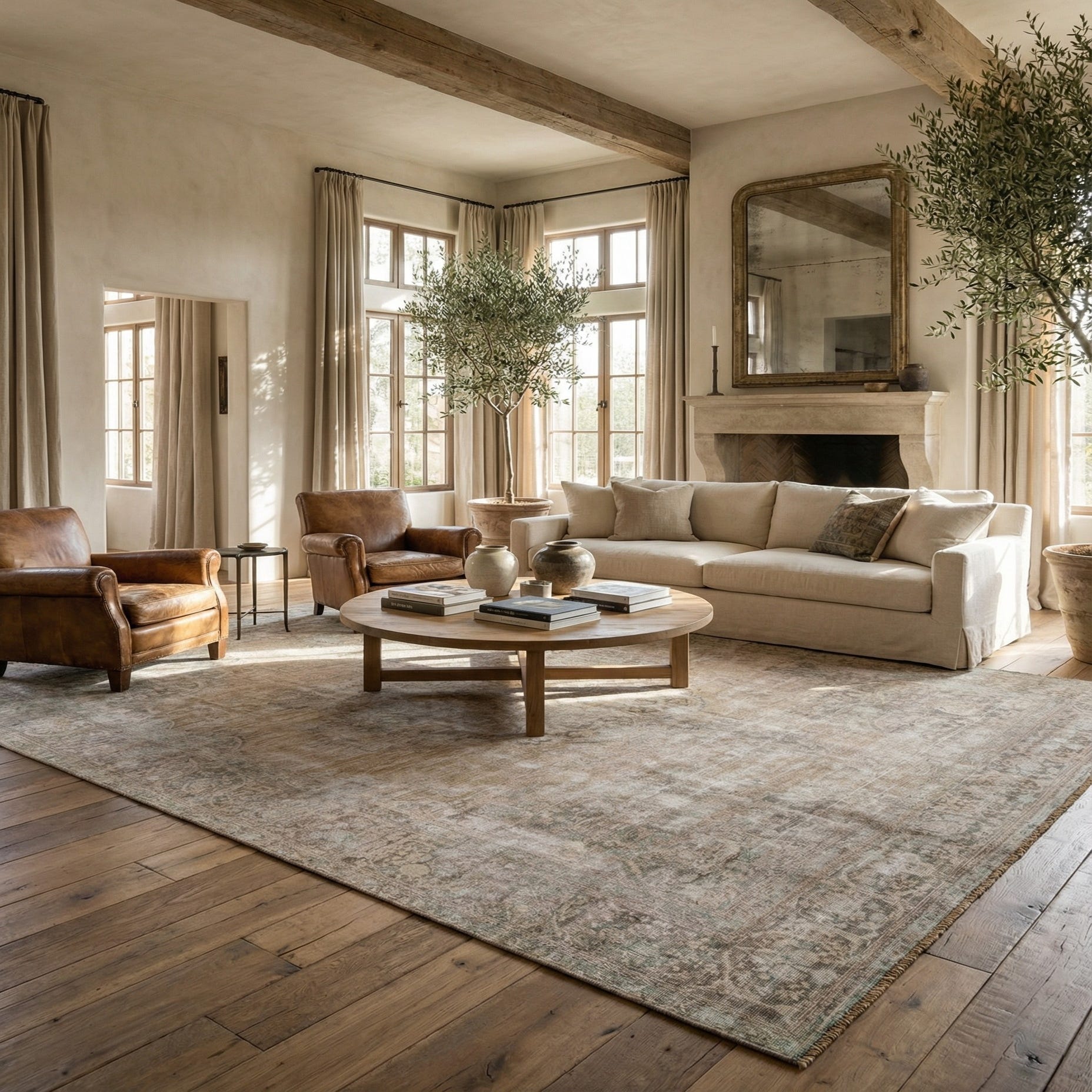 A 10x13 rectangular brown and tan Persian-style wool rug with a distressed medallion pattern, ideal for a living room.