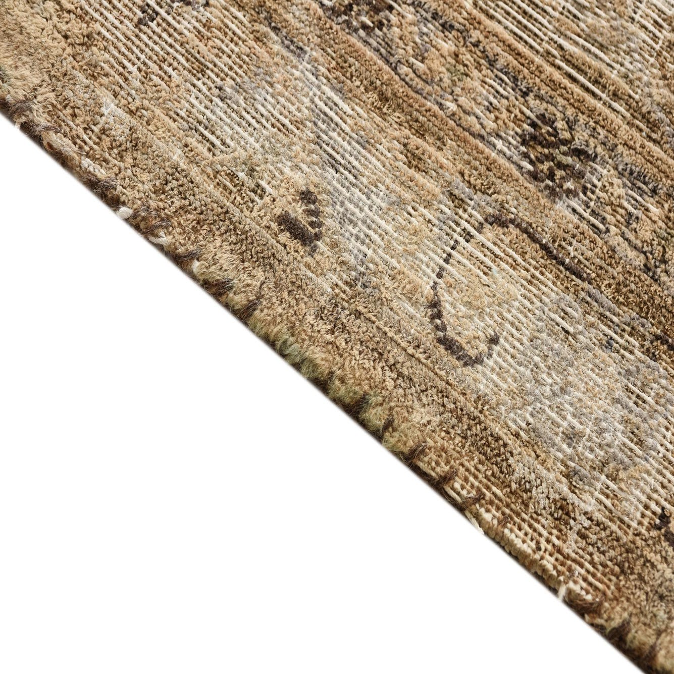 This Ultra Vintage collection rug is a large 10x13 foot area rug hand-knotted from 100% wool, offering a distinctive blend of durability and tactile pleasure. The palette of brown, green, and ivory hues creates a warm, versatile color scheme, while the brown background anchors the piece with a sense of depth and richness. Traditional patterns show intricate floral and botanical motifs, achieving an elegant timeworn look that suggests a narrative of heirloom quality. The rug's texture is enhanced by the natural variation in the wool fibers, which provides an engaging surface underfoot.