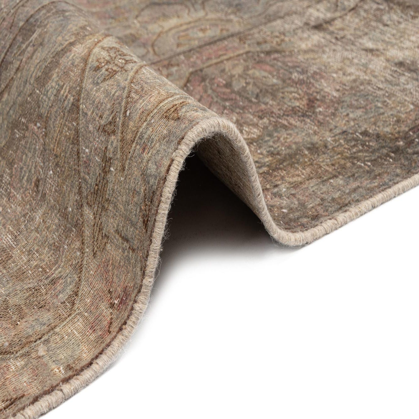 A 10x13 rectangular Persian wool rug featuring an ornate medallion and border pattern in distressed browns, tans, and hints of muted pink.