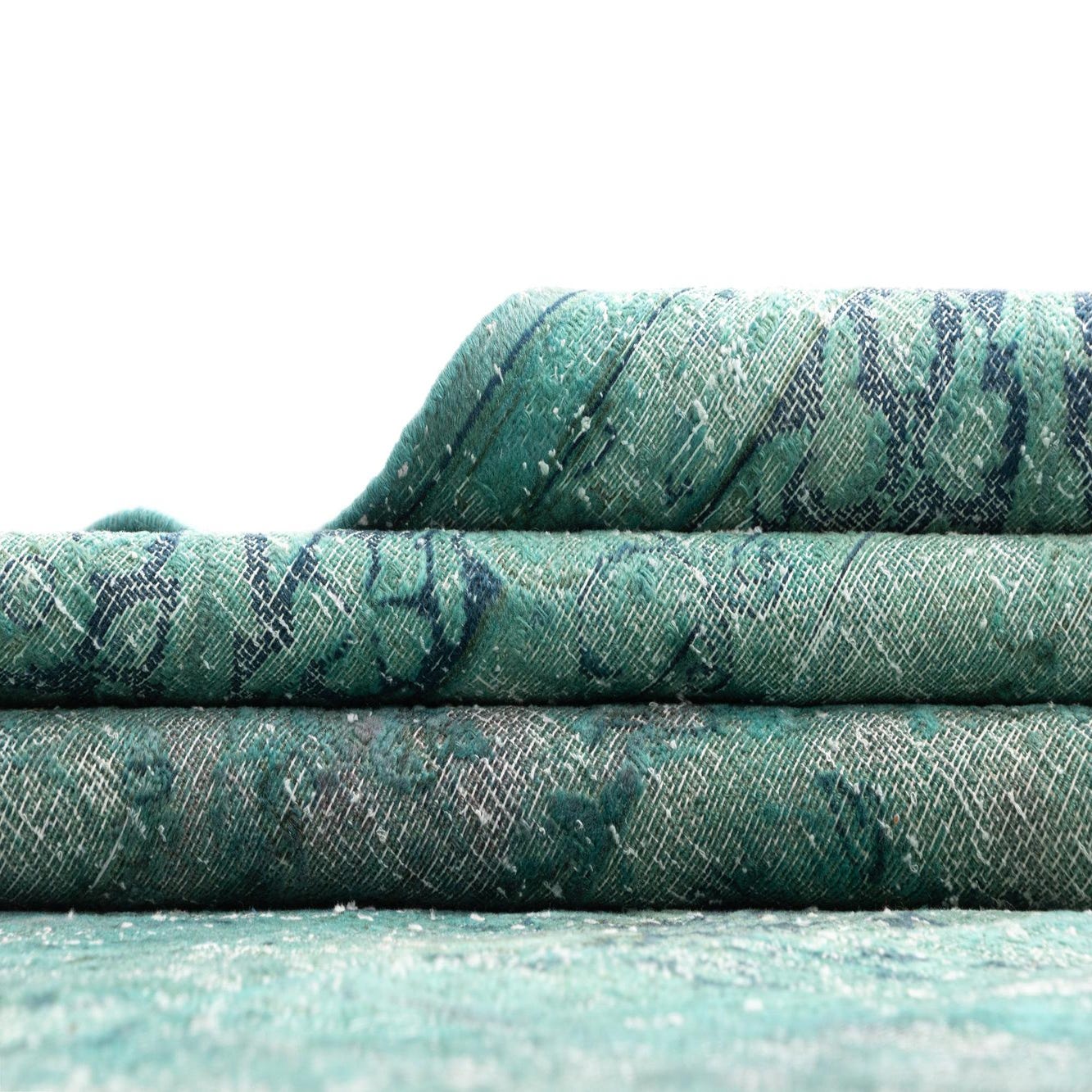 A warm brown background anchors this hand-made 100% wool rug, providing a soft, earthy base for the layered, timeworn pattern. The central field carries a gently distressed floral and arabesque motif rendered in muted green and grey, while dark blue accents outline the ornamental border and small flourish details. The surface has a low, dense pile with subtle variations in height and sheen from the hand-made construction, offering a tactile softness underfoot and a lived-in, handcrafted character to the room.