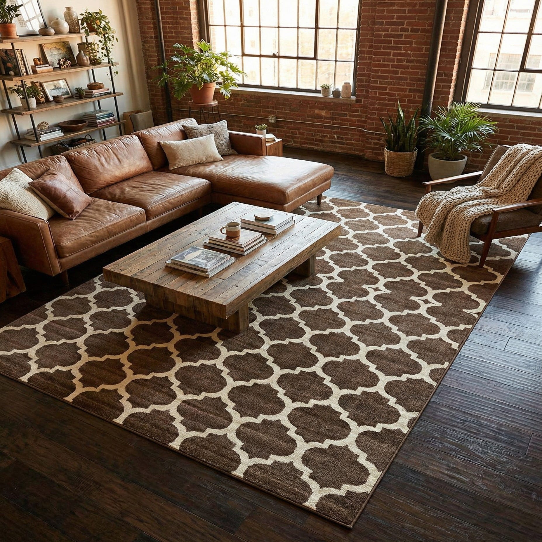 A warm brown field provides the backdrop for a repeating beige trellis in this machine?made polypropylene rug. The pattern is a Moroccan?inspired lattice of rounded quatrefoil shapes that creates steady visual rhythm across the floor without overwhelming a space. The beige lines are crisp against the brown ground, lending the rug a tailored, grounded look that complements both traditional and transitional interiors.
