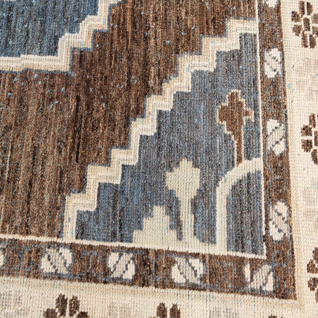 A 10x14 rectangular brown and blue Moroccan tribal wool shag rug with a bold geometric medallion pattern and floral border.