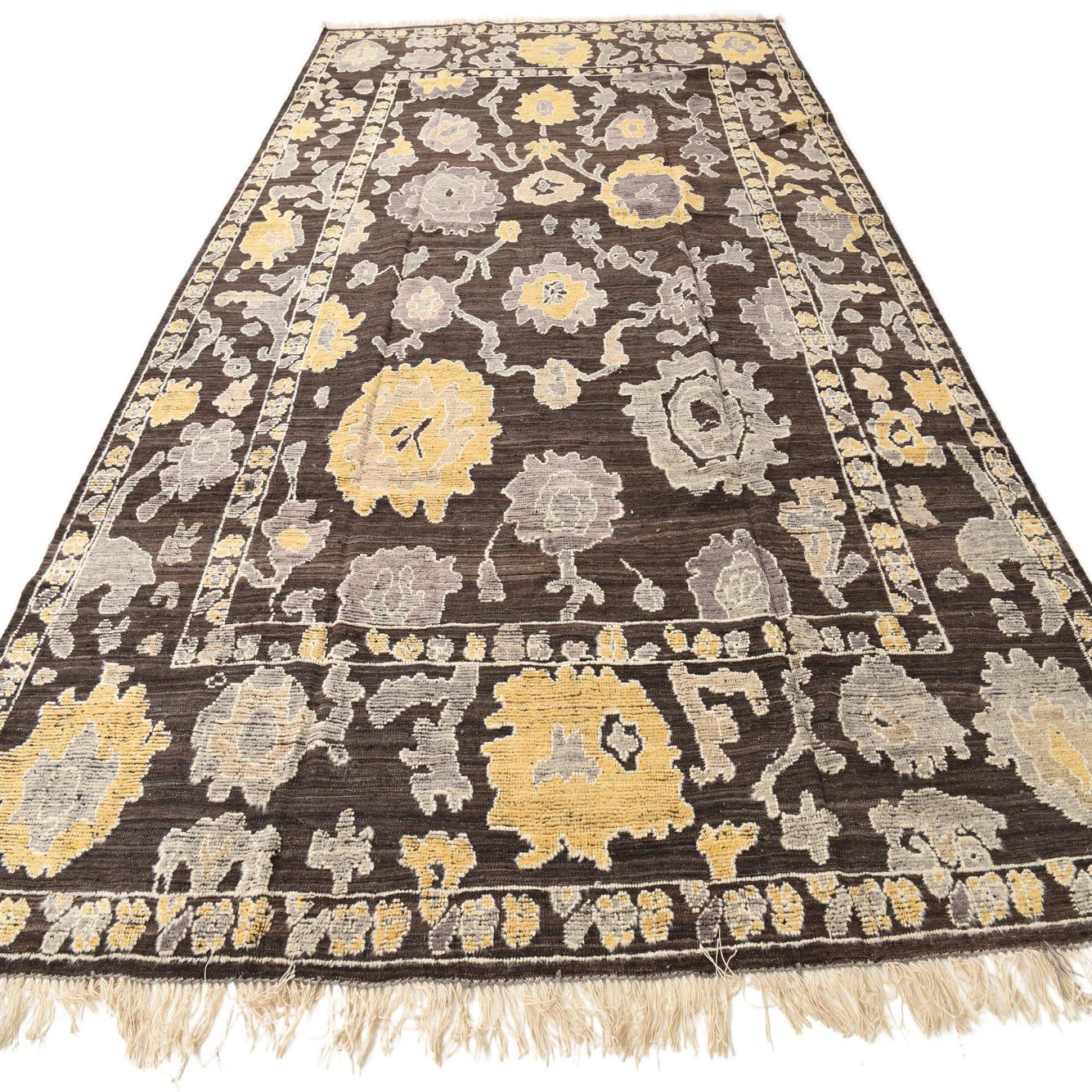 A rectangular 10x14 Oushak rug in brown with abstract yellow and gray floral patterns, featuring a medium pile and fringed ends.