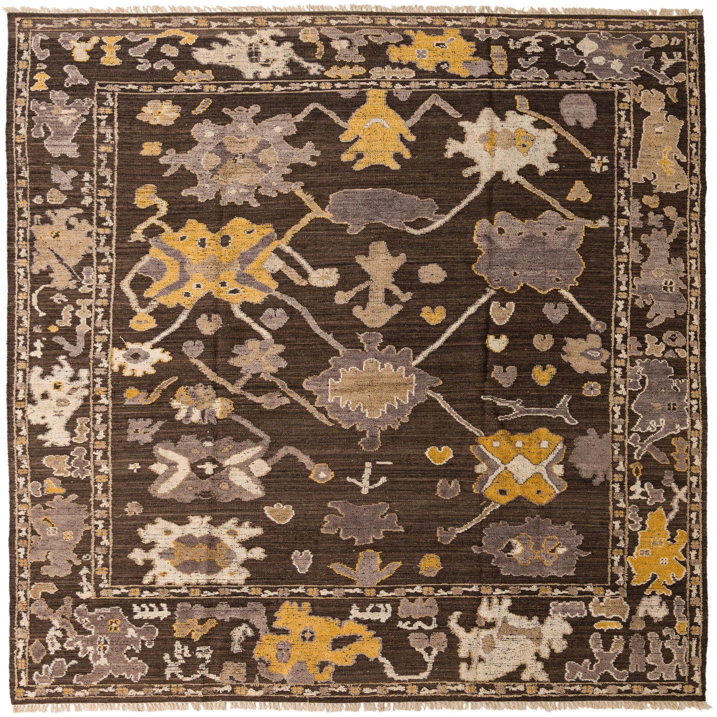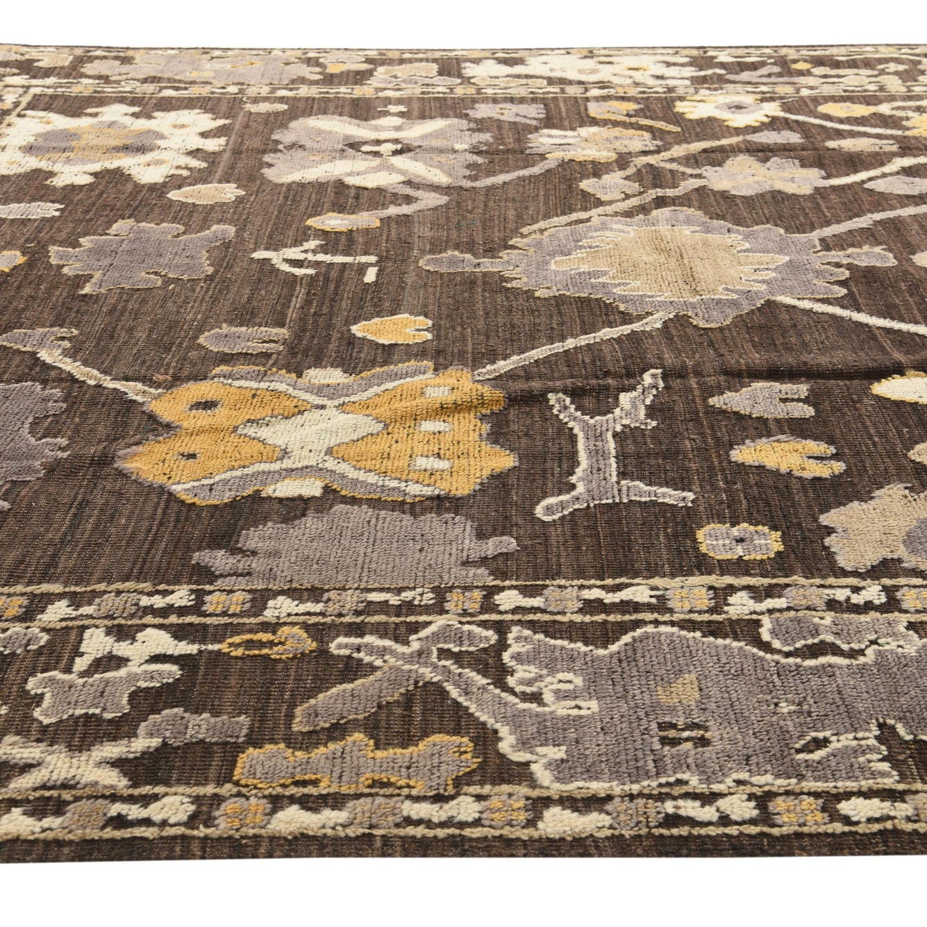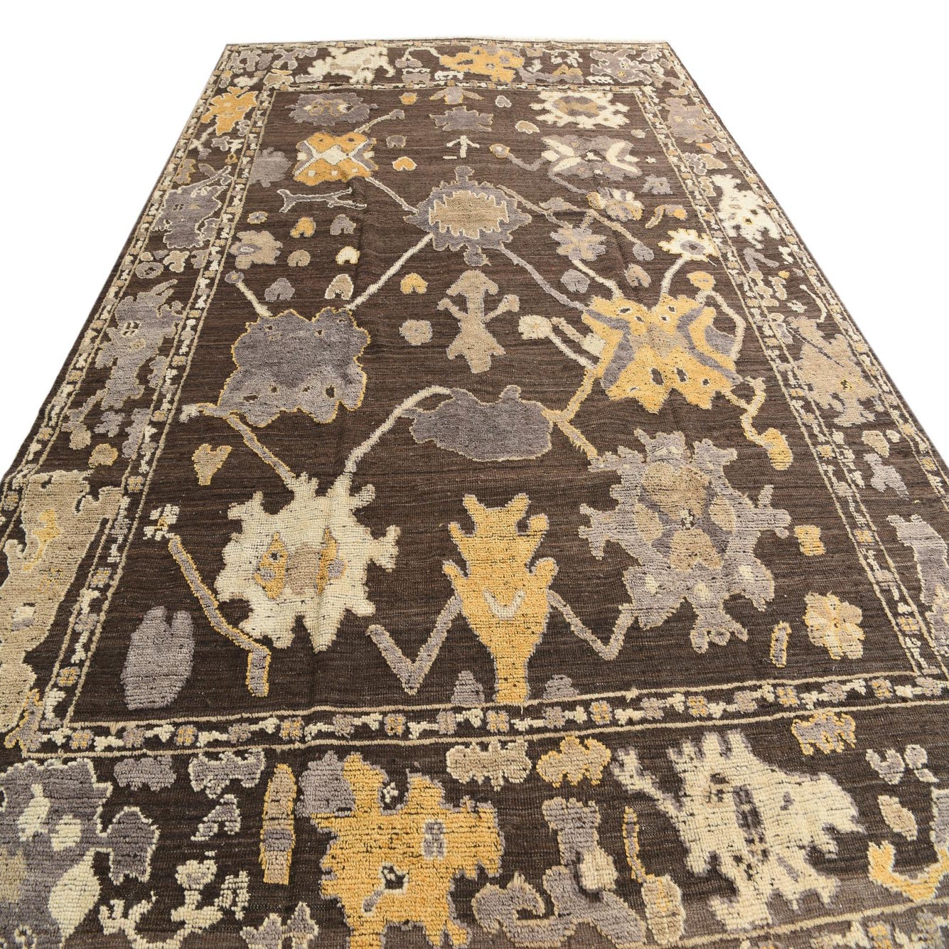 A 10x14 rectangular Oushak wool rug with a dark brown background and a floral botanical pattern in tan, gold, and light brown.
