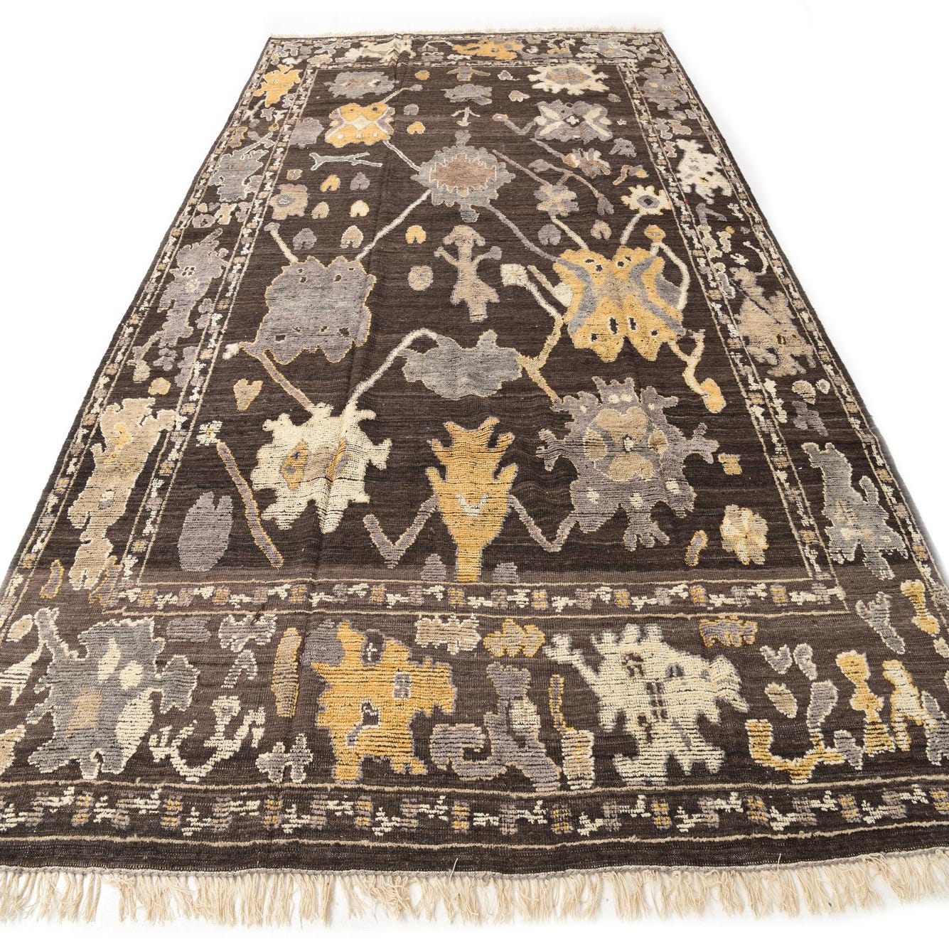 A 10x16 rectangular Oushak rug with a dark brown background and abstract patterns in tan, grey, and gold.