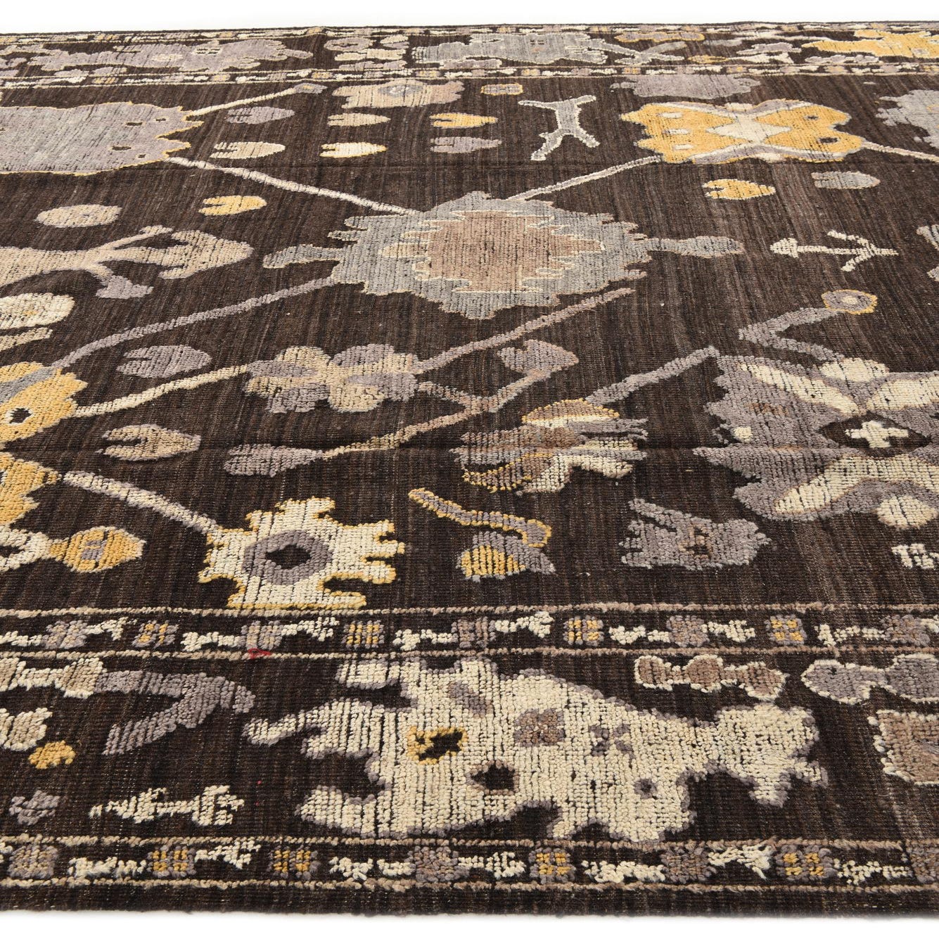 The Oushak Hand Knotted Rug is a sizable 10x16 piece, meticulously crafted from 100% wool, providing both durability and a soft underfoot texture. It showcases a rich brown background accented by a nuanced palette of beige, gray, ivory, and yellow highlights. This rug features traditional Oushak motifs, including stylized floral and geometric patterns, contributing to its timeless appeal.