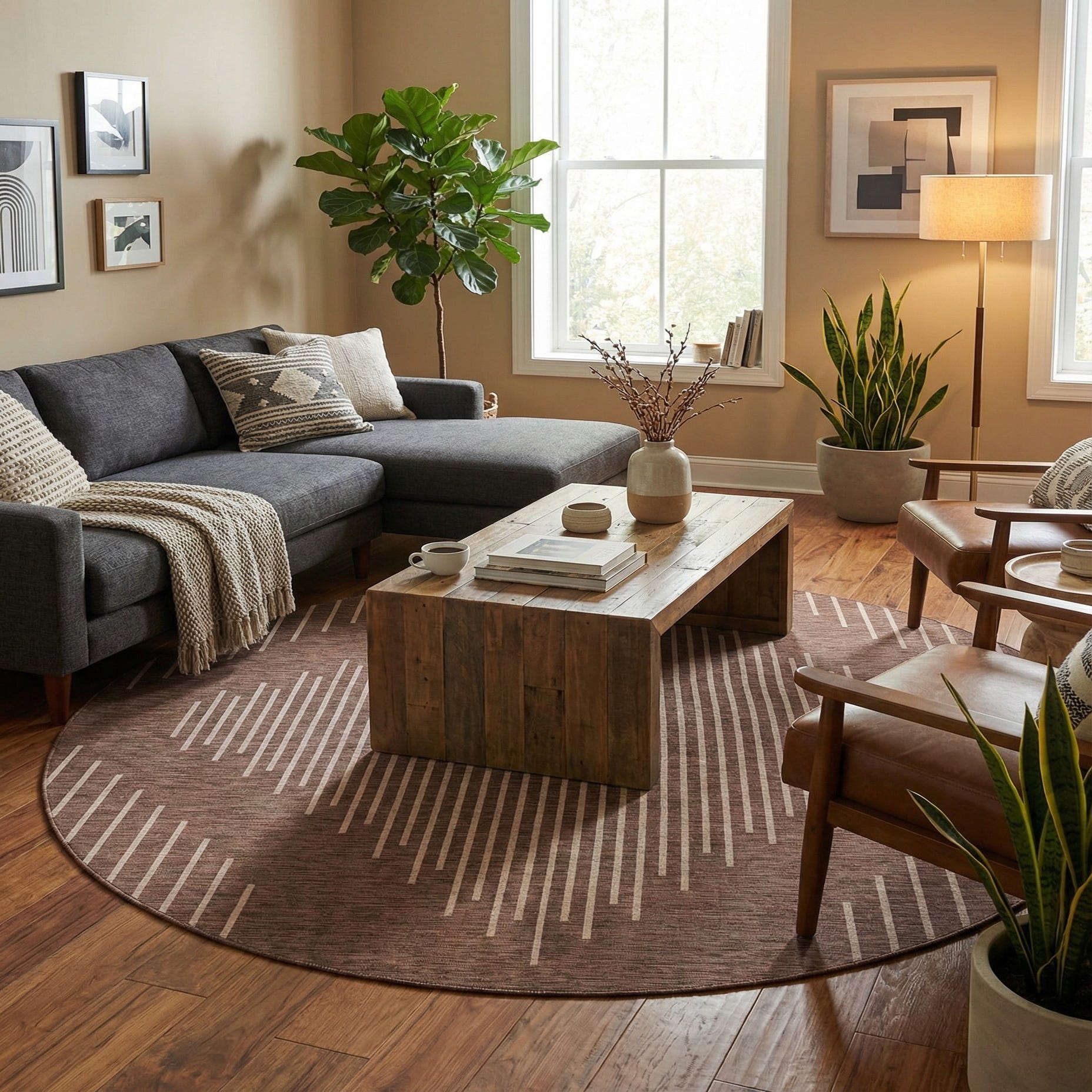 This round rug is well suited to casual indoor-outdoor settings and contemporary interiors. Use it beneath a circular dining table on a covered patio or to anchor a seating group in a modern living room or screened porch. The brown-and-ivory palette pairs nicely with rattan or metal furnishings, warm wood tones, and minimalist décor, adding graphic interest without competing with other elements.