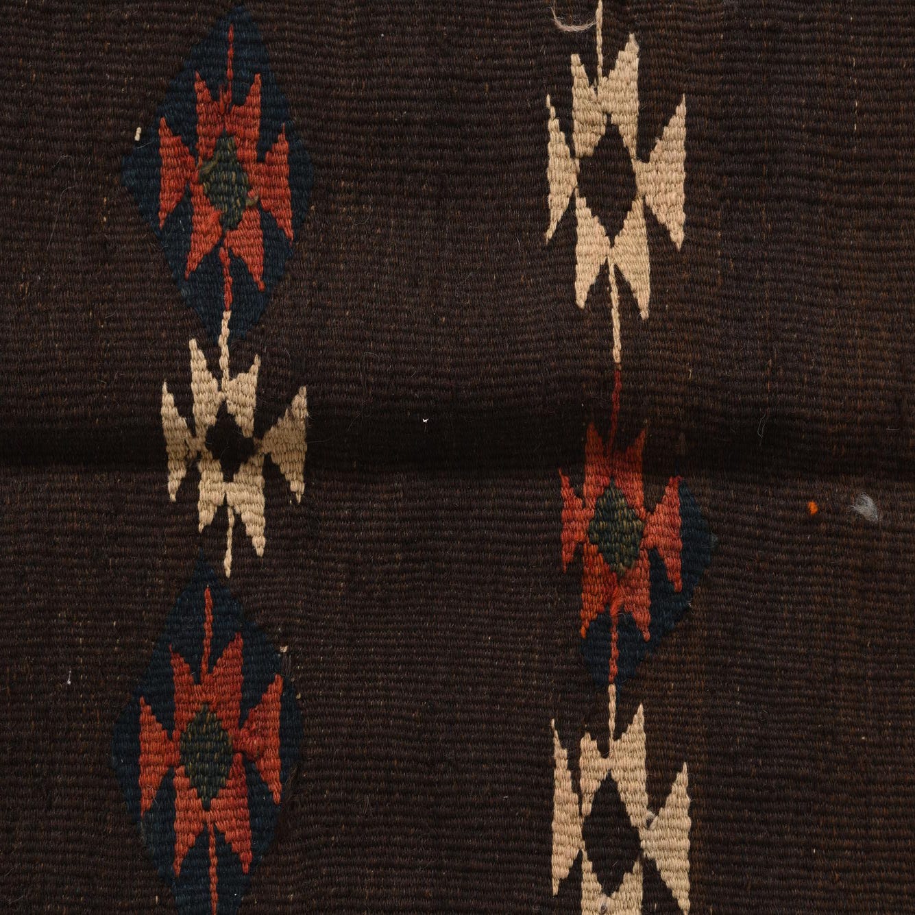 This Kilim Fars 11 Ft Runner is handwoven of 100% wool, offering a warm and inviting texture underfoot. The semi-antique rug, aged between 40 to 60 years, carries a deep brown background, harmoniously complemented by accent hues of orange, ivory, and navy blue. Geometric patterns and tribal motifs are distributed throughout the runner, providing a balance of tradition and aesthetic appeal.