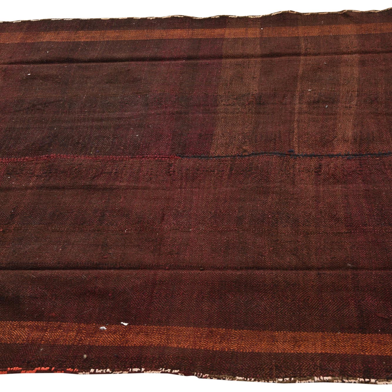 The Kilim Fars Collection offers a hand-woven runner crafted from 100% wool, showcasing a range of warm tones. The primary brown backdrop is complemented by stripes in black, light brown, and orange, offering an earthy and grounding aesthetic. With a length of 11 feet, this runner exhibits a subtle yet impactful design that can serve as a versatile addition to various interior spaces.
