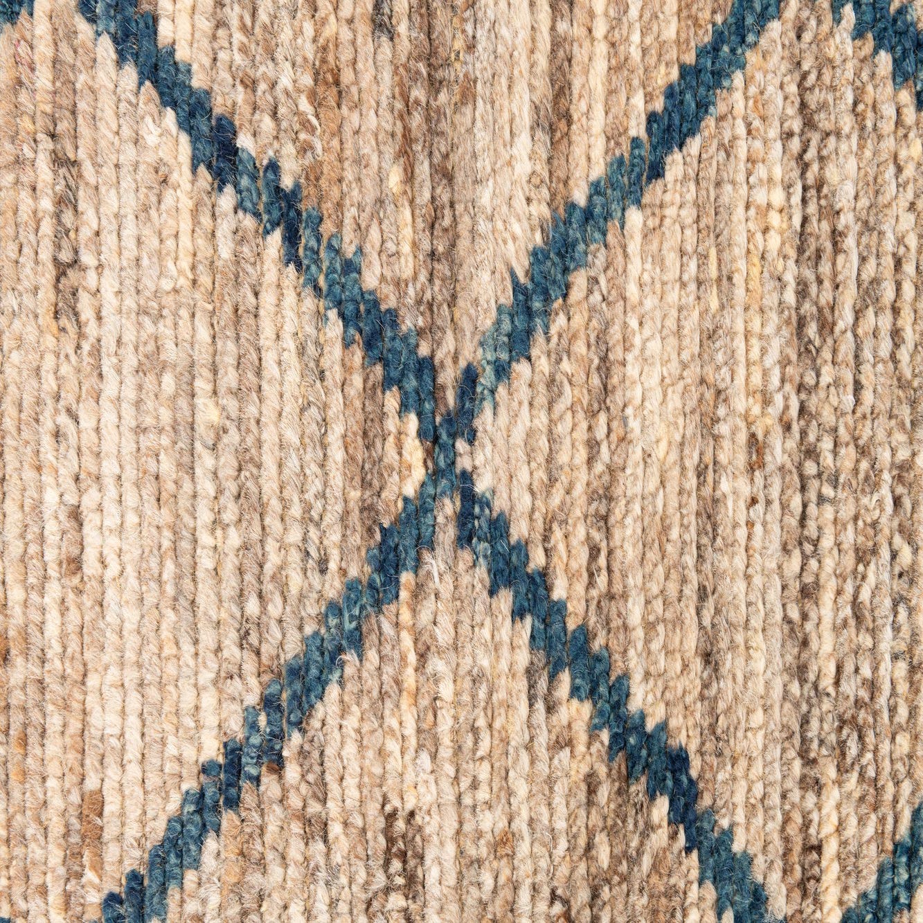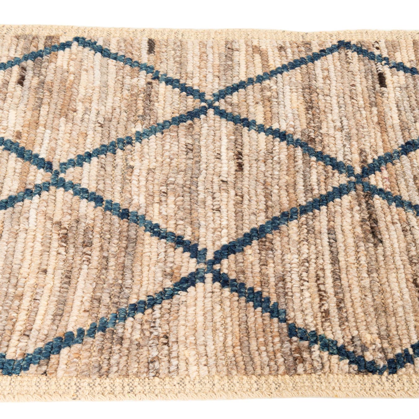 A long 11 ft runner rug featuring a natural brown and tan shag texture with a repeating navy blue tribal diamond pattern, perfect for a hallway.