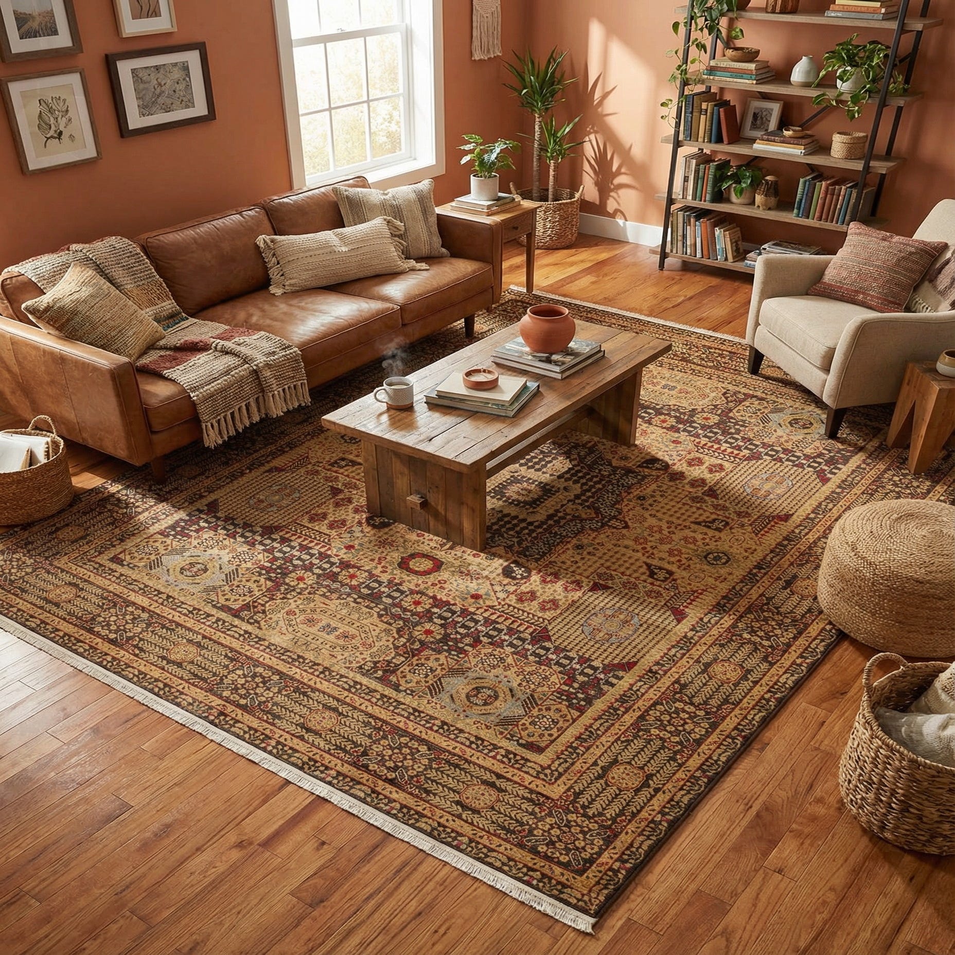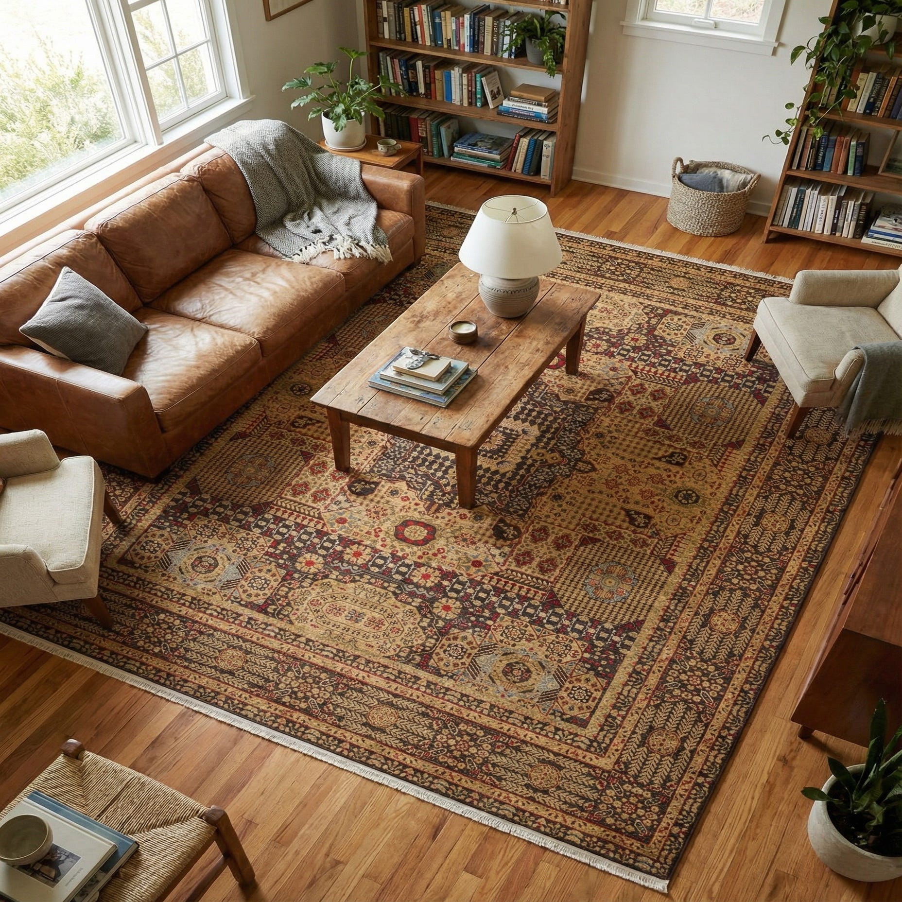 This rug fits well in classic, transitional, or eclectic interiors. Place it under a living-room seating arrangement to ground warm wood furniture and leather sofas, layer it beneath a dining table to add ornate pattern without overwhelming the space, or use it in a study or entry to introduce refined color accents. Its structured pattern and balanced palette make it easy to coordinate with neutral upholstery or with fabrics and accessories that pick up the rug’s light-blue or olive tones.