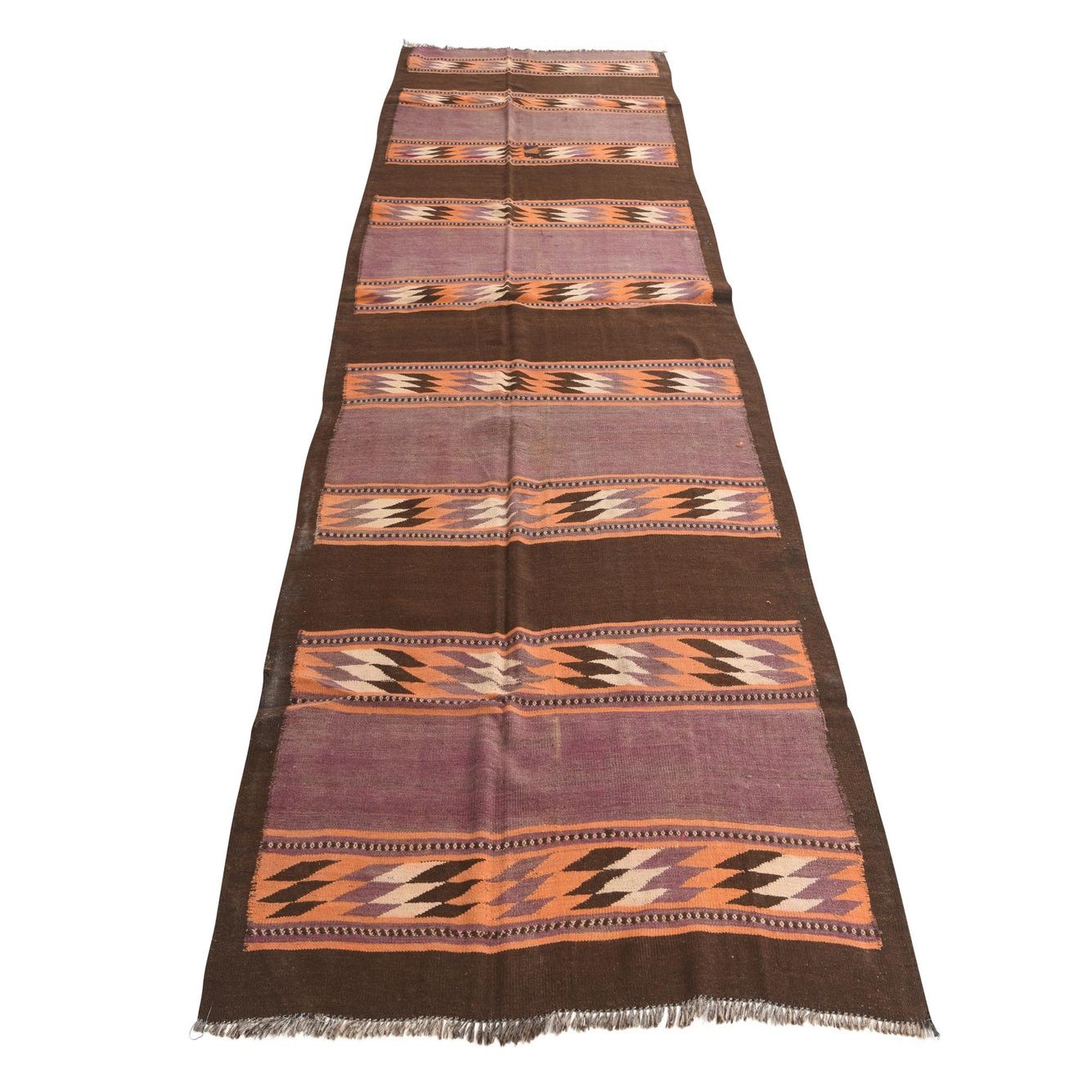 A 12 ft Kilim Fars runner rug with brown, purple, and orange stripes and tribal patterns, ideal for a hallway.