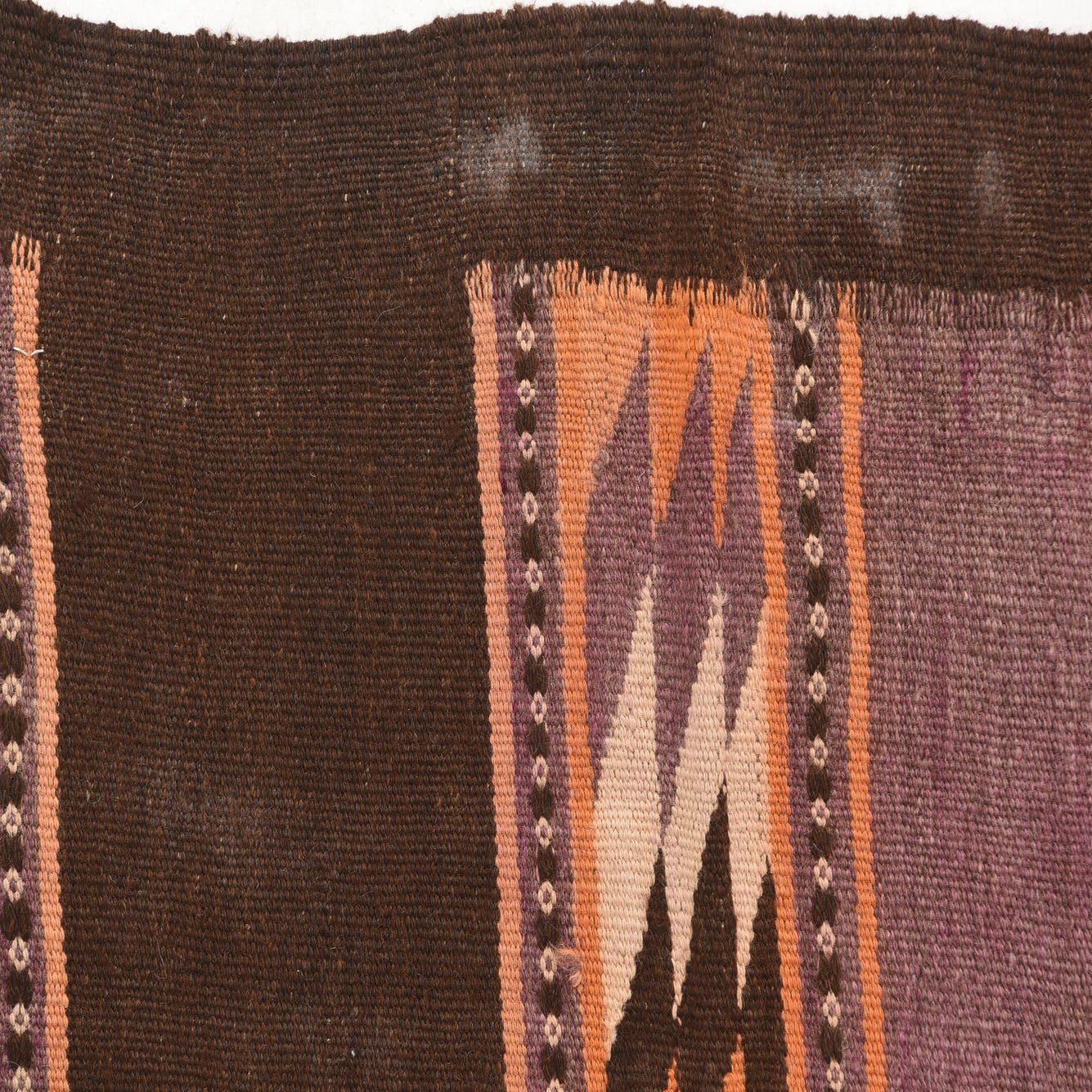 Primary color is Brown. Colors in this rug include: Brown, Ivory, Orange, Purple.