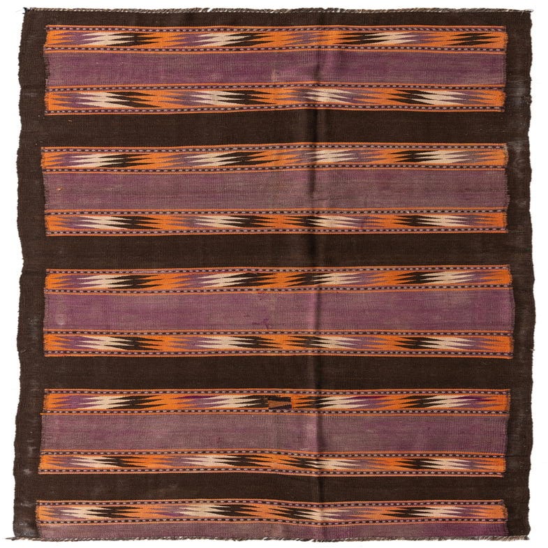The Kilim Fars collection presents a 12-foot runner hand-woven from 100% wool, offering a sturdy and tactile texture. This semi-antique piece, categorized as 40-60 years old, showcases a distinctive pattern with horizontal stripes and geometric motifs. The rich brown background is complemented by contrasting elements in ivory, orange, and purple, adding visual interest and a touch of vibrancy to the design. Fringes at both ends of the runner lend an additional traditional aesthetic.