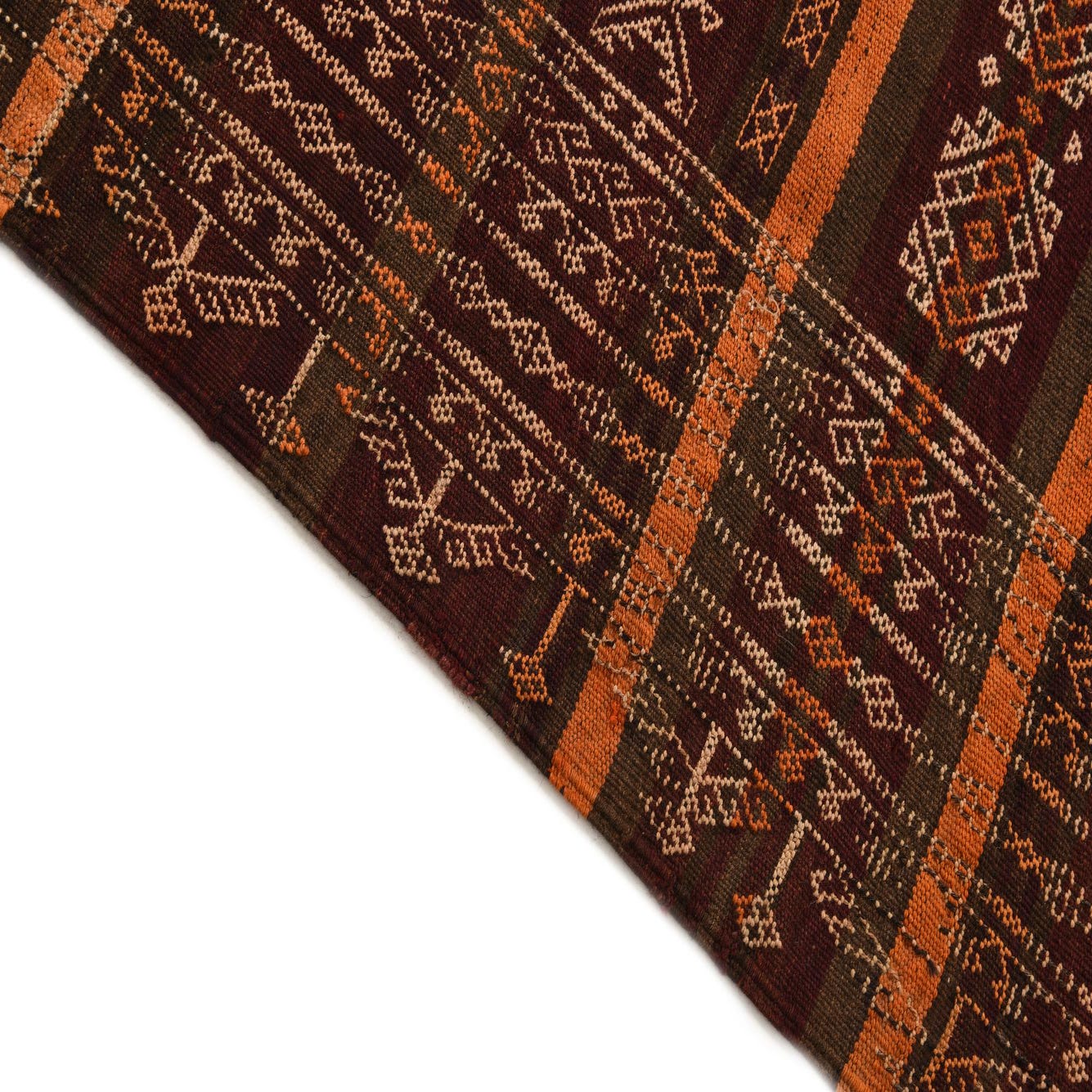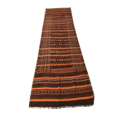 A 12 ft runner rug from the Kilim Fars collection, featuring a tribal Persian pattern in browns and tans.