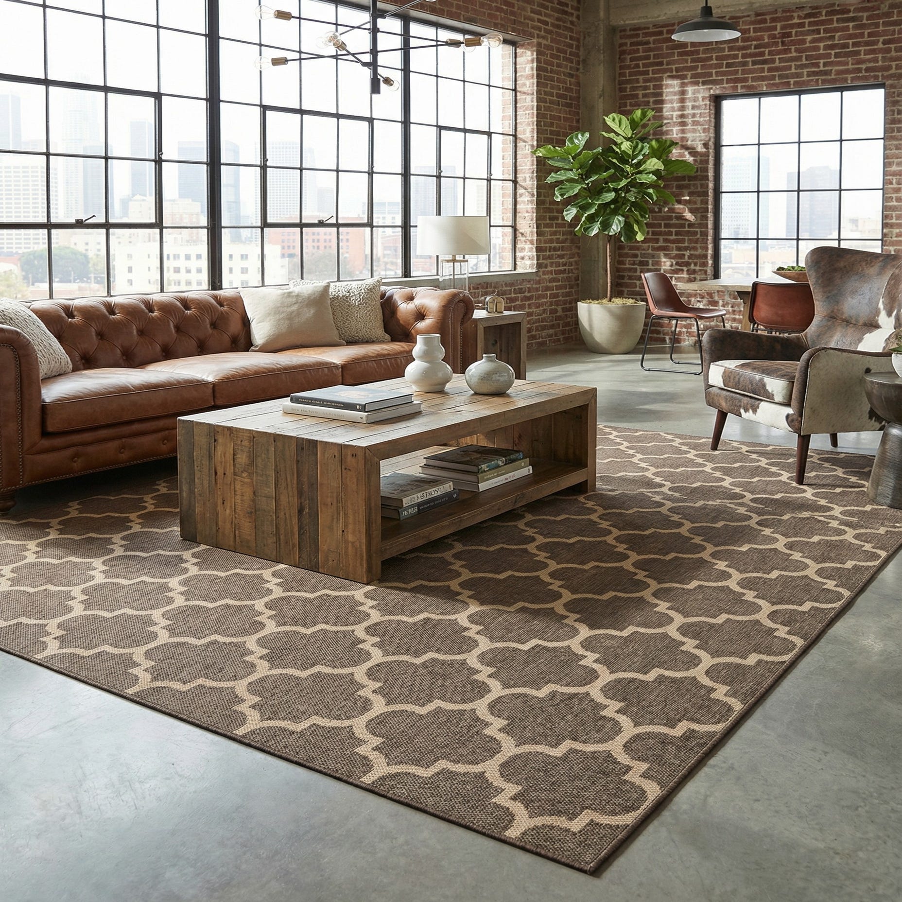 The rug's pattern incorporates a brown backdrop with natural color detailing, lending itself to a variety of interior styles, from the contemporary to the traditional, and especially suited for transitional spaces. The machine-woven polypropylene construction ensures durability while maintaining a soft texture underfoot. The flatweave design contributes to the rug's resilient nature, making it a fitting choice for high-traffic areas or homes with pets, as the rug's surface is designed to be pet friendly and shed-free.