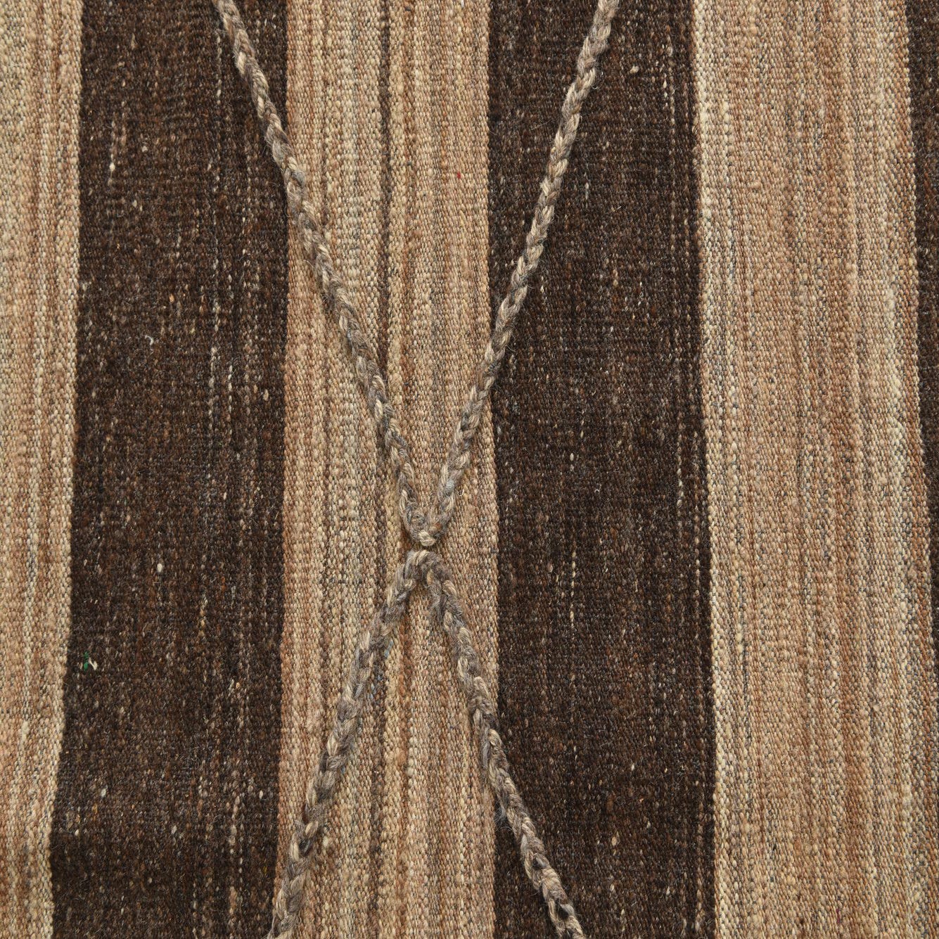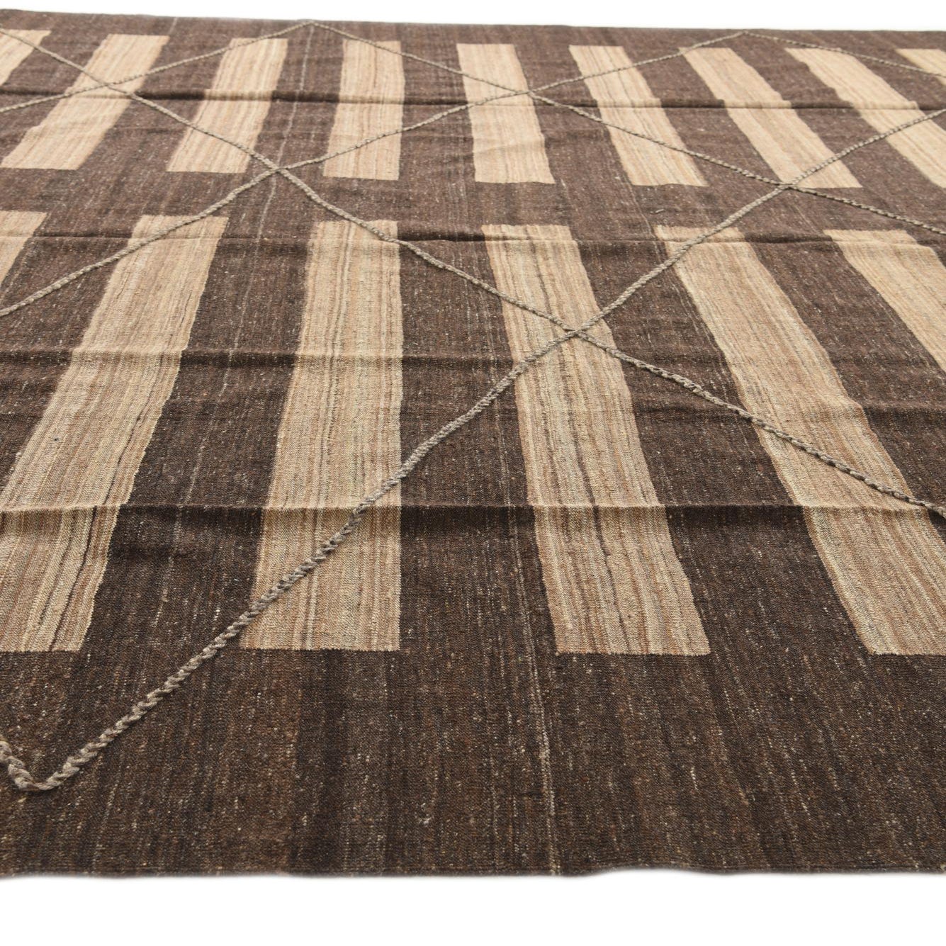 A large square Rugs.com Kilim Modern wool rug featuring a tribal pattern of dark brown and tan vertical stripes with a subtle diamond overlay.